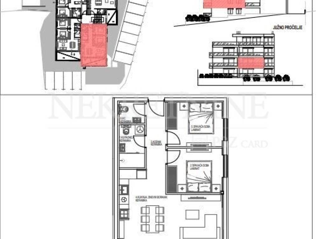 1. kat: 64.84 m2 (terasa 12.60 m2, 1 parking mjesto)