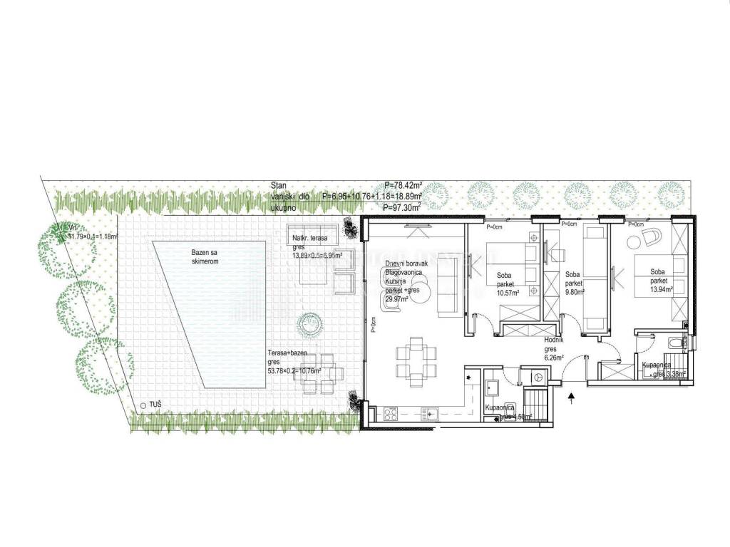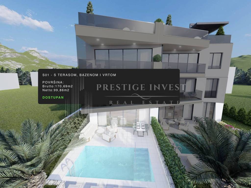 Zum Verkauf steht eine moderne Dreizimmerwohnung im Erdgeschoss eines luxuriösen Neubaus in Sukošan, in erster Reihe zum Meer, in unmittelbarer Nähe zu Strand, Cafés und Promenade.