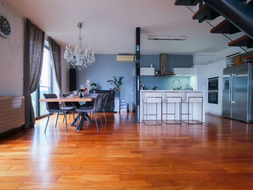 Odličan tlocrt smisleno povezuje prostor tvoreći jedinstvenu nekretninu koja se proteže na dvije etaže, uokvirena velikim staklenim stijenama i visokim stropovima koji stan čine elegantnim, ugodnim i prozračnim s mnogo svjetla. Sofisticiran dojam koji stan pruža zaokružen je modernim i decentnim uređenjem te efektnim stepeništem.