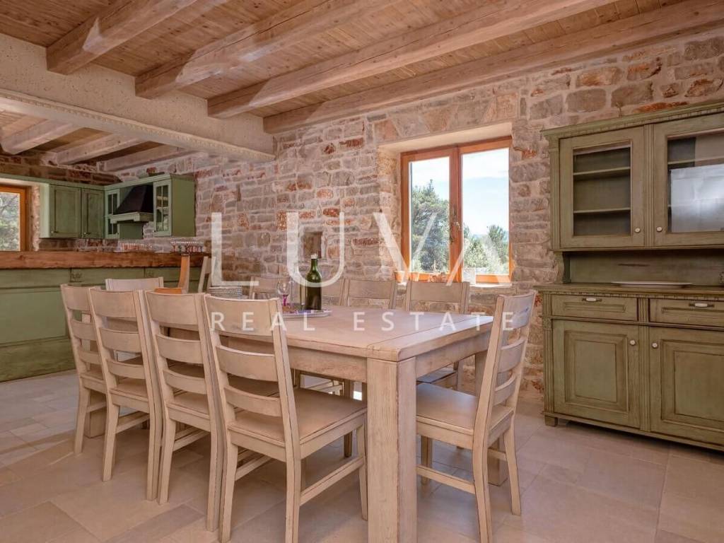 Luxusvilla mit Pool zum Verkauf in Stari Grad auf der Insel Hvar. Hvar ist bekannt als die sonnigste Insel Kroatiens und zählt auch zu den beliebtesten Inseln in Dalmatien. Diese Villa befindet sich auf einem großen Anwesen von 8.500 m2, was den Eigentümern Ruhe und Privatsphäre garantiert. Diese Luxusvilla wurde 2017 im traditionellen dalmatinischen Stil aus Stein mit schrägem Ziegeldach erbaut. An allen Fenstern befinden sich charmante grüne Holzläden, die der Villa zusätzlichen Charme und Wärme verleihen. Die Villa verfügt über ein geräumiges Wohnzimmer, eine voll ausgestattete Küche und 5 Schlafzimmer mit eigenen Badezimmern. Das Interieur der Villa ist wie das Exterieur im traditionellen Stil gehalten, mit dominierenden Steinwänden und rustikalen Holzmöbeln. Auf dem Anwesen befindet sich ein Außenpool und ausreichend Platz zum Parken.