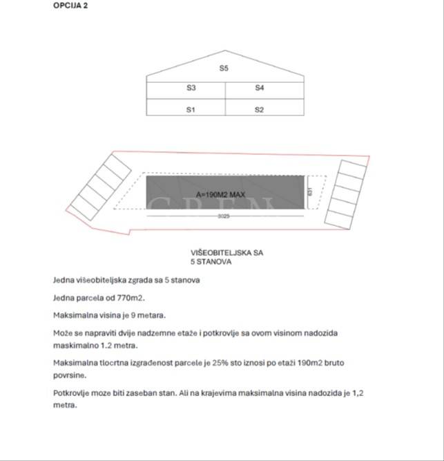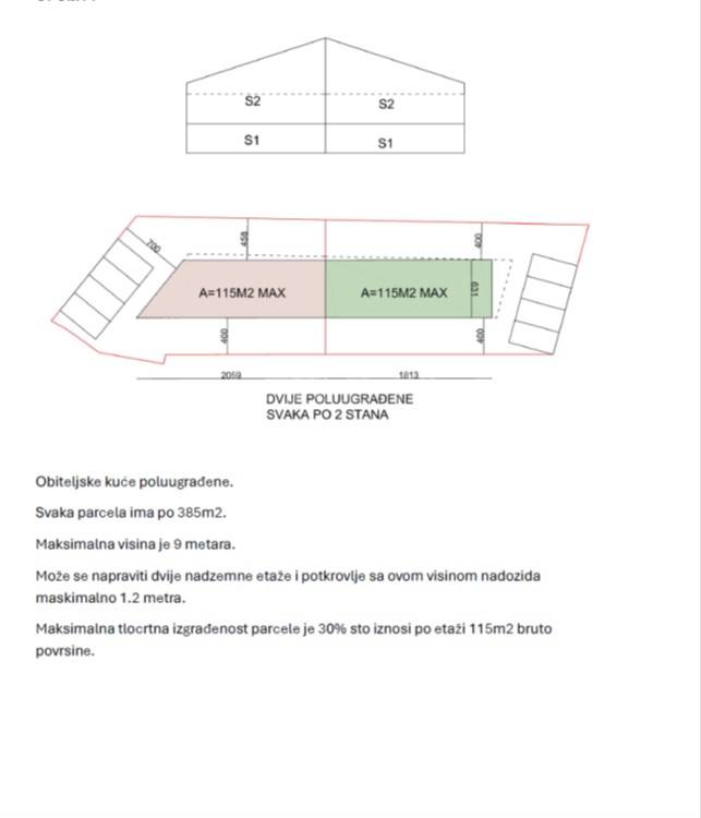 Prodaje se ovo građevinsko zemljište udaljeno cca 3000 m do mora a do centra Poreča cca 5000 m. Na zemljištu dozvoljena gradnja dvije obiteljske kuće ( dvojne ) svaka sa dva stana ili zgrada sa 5 stanova. Maximalna visina kuće je 9 m. tj. Prizemlje + kat + potkrovlje. Izgrađenost 25 % za zgradu sa 5 app i 30 % za dvojnu kuću. Parcela ima put sa dvije strane a struja , voda i kanalizacija su pokraj parcele.