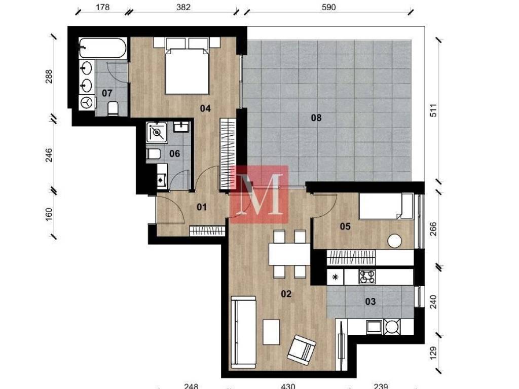 Beautiful 3-room apartment (75.11 m²) with a large terrace on the top floor (3rd) of a newly constructed building.