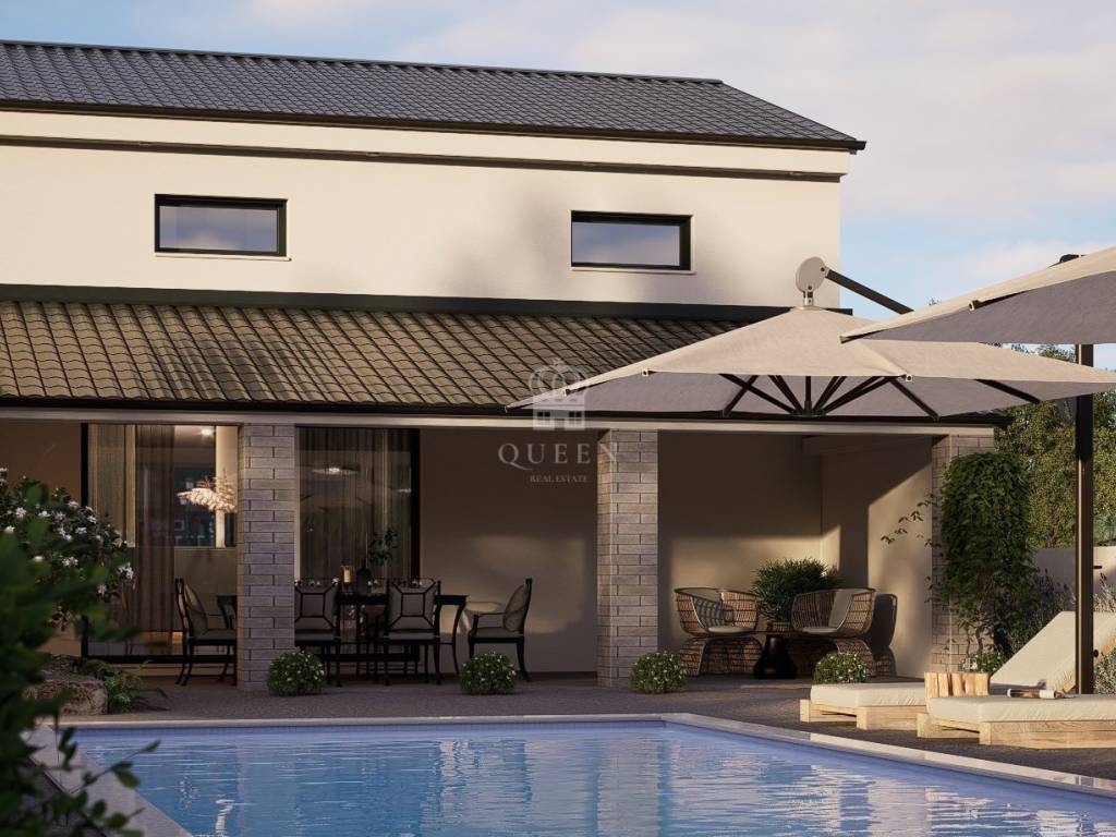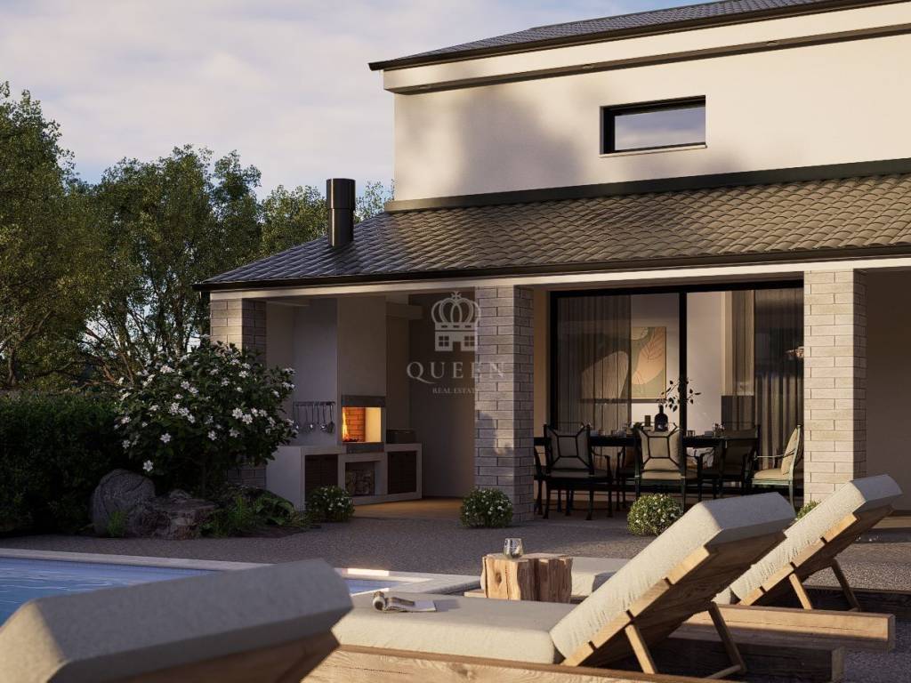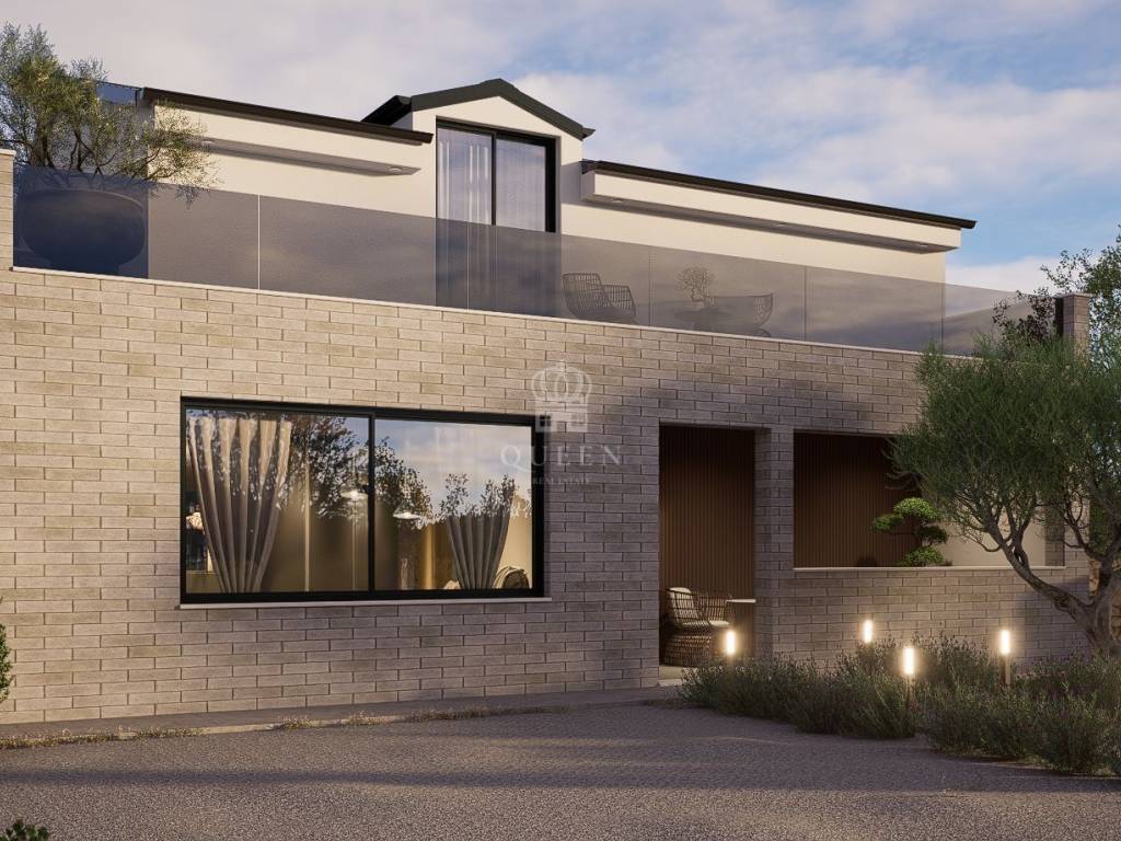 Kuća površine 169m2 sastoji se od open space kuhinje sa dnevnim boravkom, kupaonice te terase. Unutarnjim stepenicama penje se na prvi kat kuće gdje su smještene 3 spavaće sobe te prostrana kupaonica sa vešerajem.