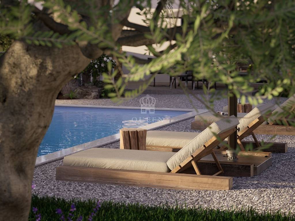 Preostali dio dvorišta će ostati u travnatoj površini u kombinaciji sa mediteranskim biljem. Terasa ima betoniranu izoliranu i drenažnu vazu sa posađenom maslinom.