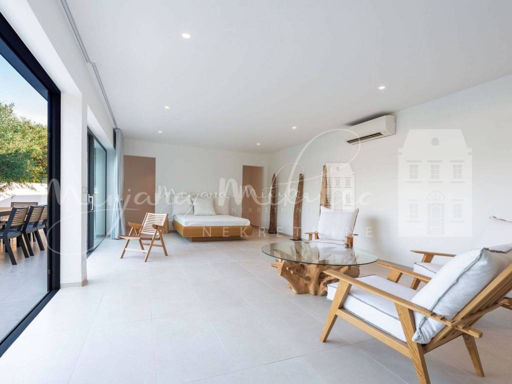 Gornja etaža: open space- kuhinja sa blagovaonicom, dnevni boravak te izlaz na prostranu terasu sa predivnim pogledom na more. Ono što ovu nekretninu čini zanimljivom je to što se dnevni boravak otvara i prema terasi ( moru) sa jedne strane te prema dvorištu sa bazenom ( 12m) sa druge strane. Uz bazen se nalazi vanjski tuš te tzv poolhouse ( pomoćni objekat uz bazen) koje je zapravo apartman od 56 m2 sa terasom od 41 m2.
