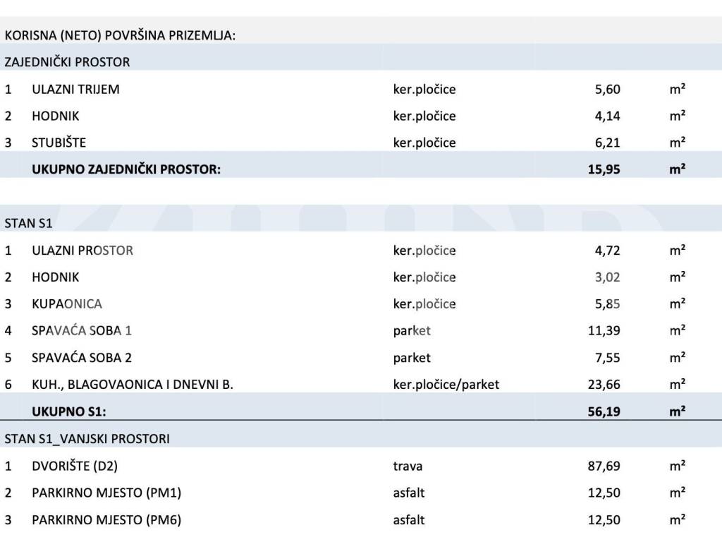 S1 - Dnevni boravak s kuhinjom i blagavaonicom, dvije spavaće sobe, kupaonica, ukupne površine 56,52 m2 + vrt 88 m2 + 2 parkirna mjesta = 199.388 eura