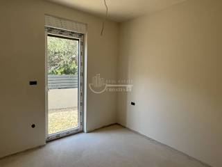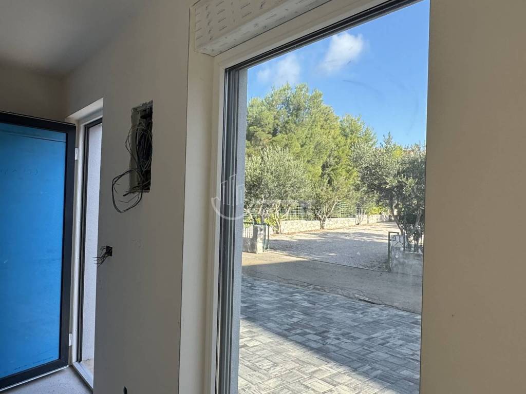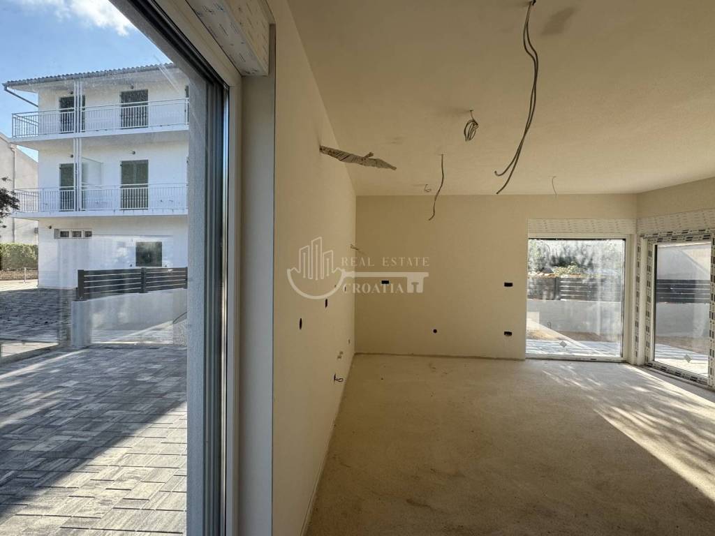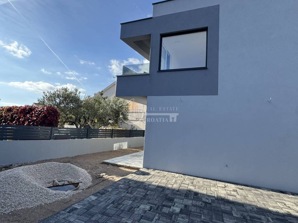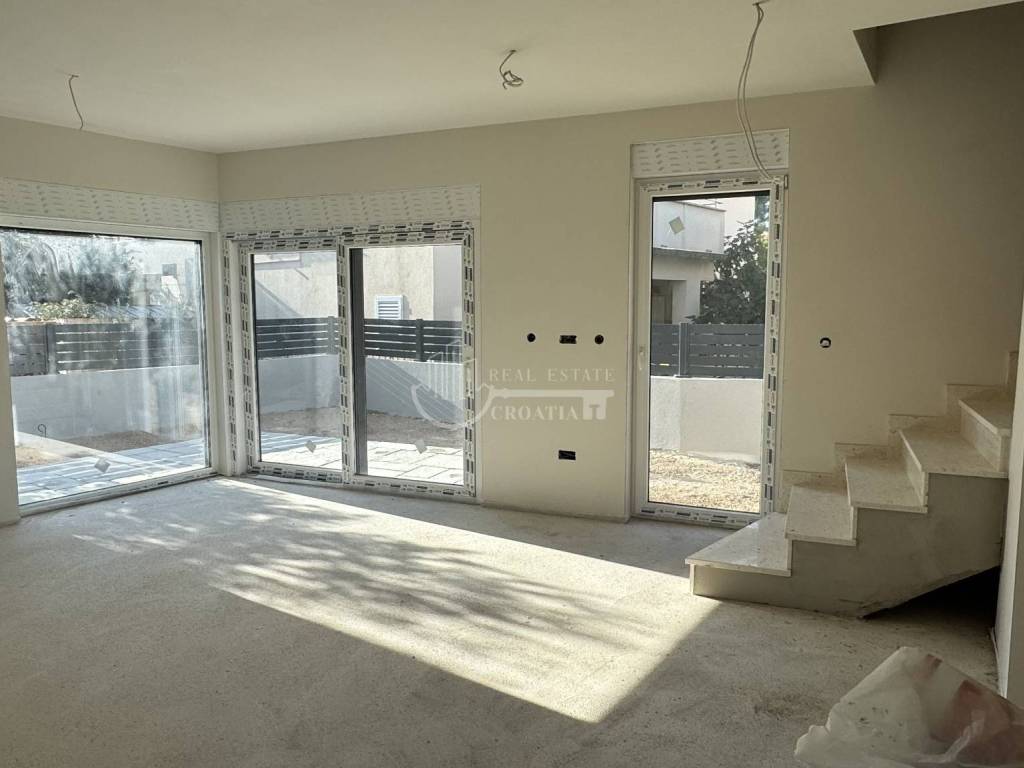 Prodaje se lijeva jedinica moderne dvojne kuće, udaljena samo 70 m od mora i plaže. Stan se prostire na dvije etaže, s vlastitim vrtom i parkirnim mjestom.