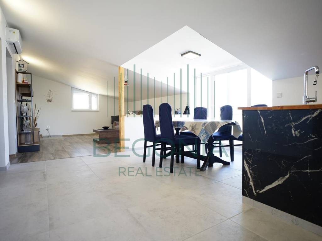 Prodaje se novouređeni apartman 104,17 m2 koji se se sastoji od dvije komforne spavaće sobe, velikog kupatila, malog wc-a, dnevnog boravka, kuhinje i blagovaone iz koje se izlazi na prostranu nenatkrivenu terasu s koje se pruža neometan pogled na morski arhipelag, planine i grad Pag. Grijanje je izvedeno uz pomoć klima jedinica. Stanu pripada jedno parkirno mjesto.