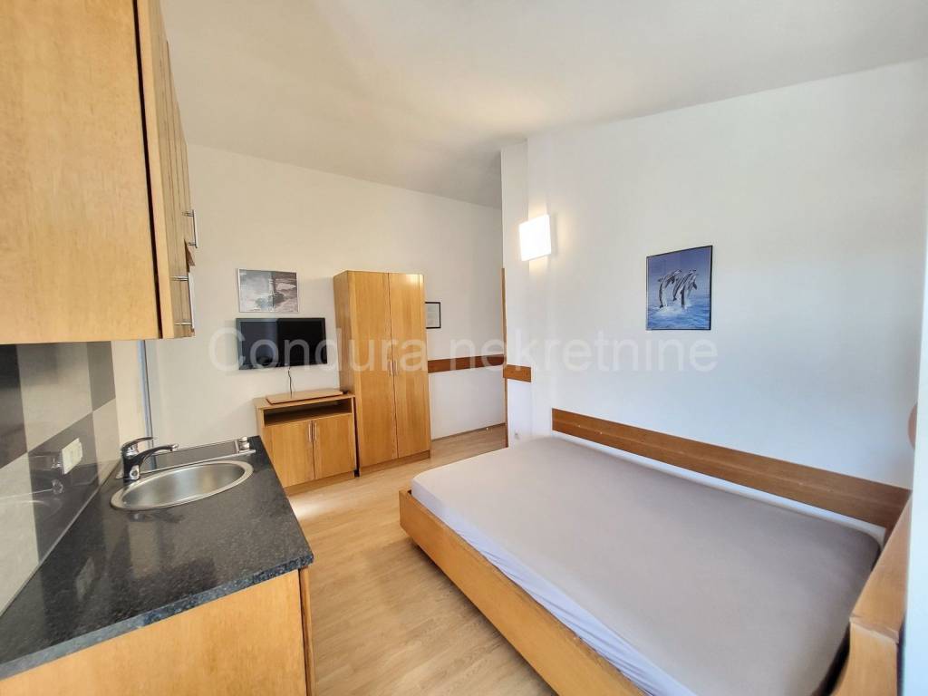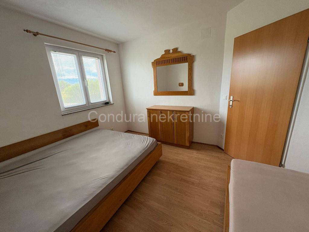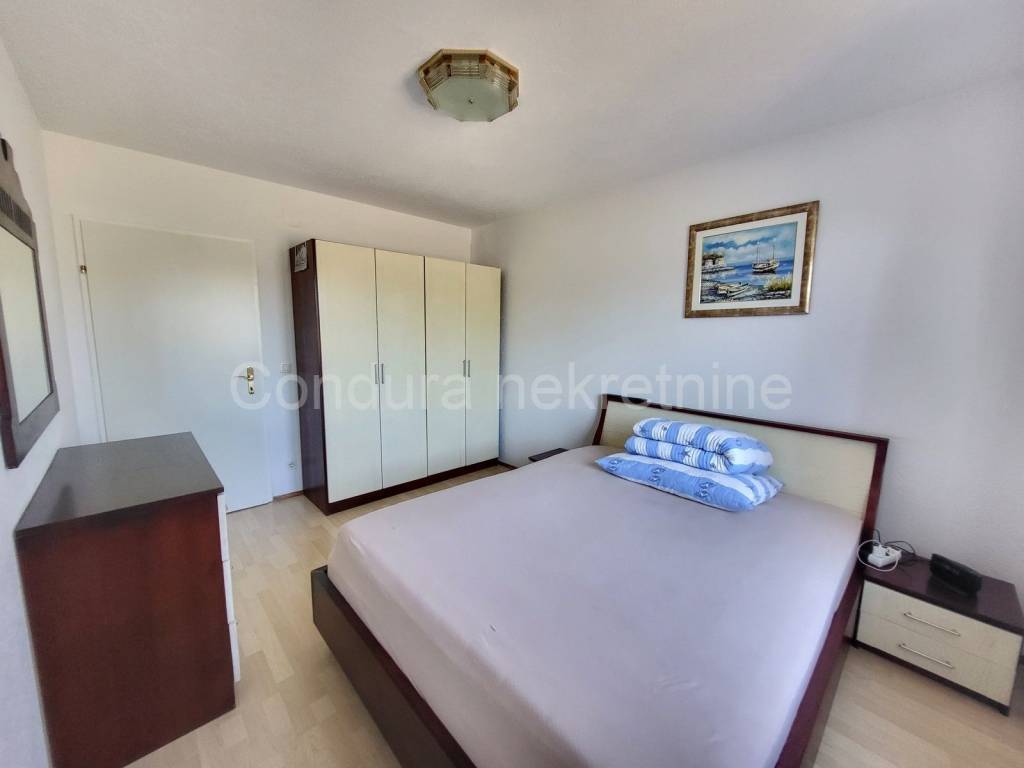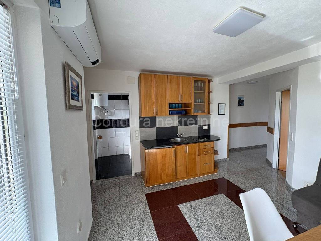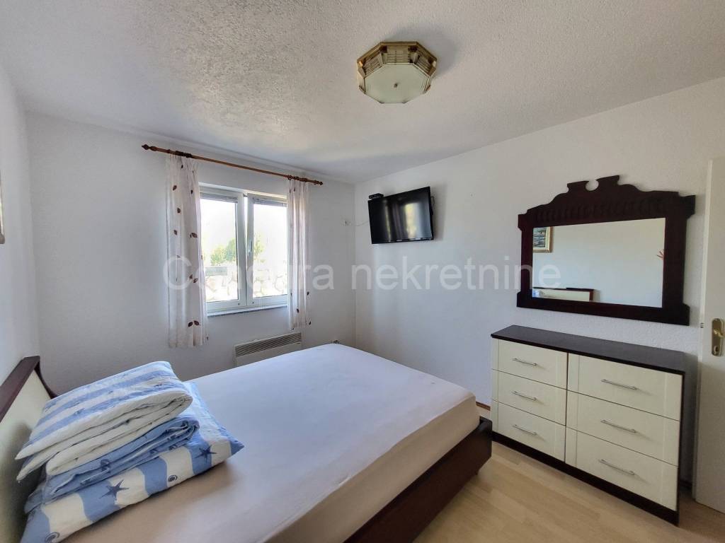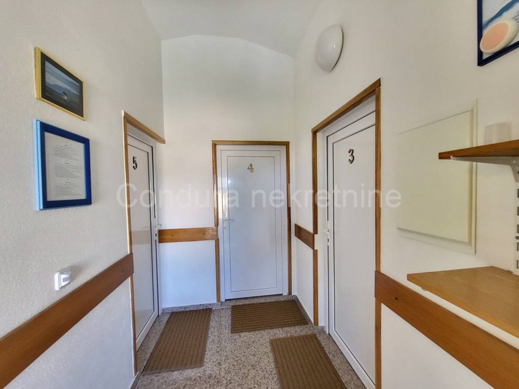 Eine Außentreppe führt in 1. Stock, wo sich zwei 2-Zi.-Wohnungen befinden: Flur, Wohnzimmer mit Küche und Esszimmer, Schlafzimmer, Badezimmer und überdachter Balkon. Eine Wohnung bietet Meerblick.