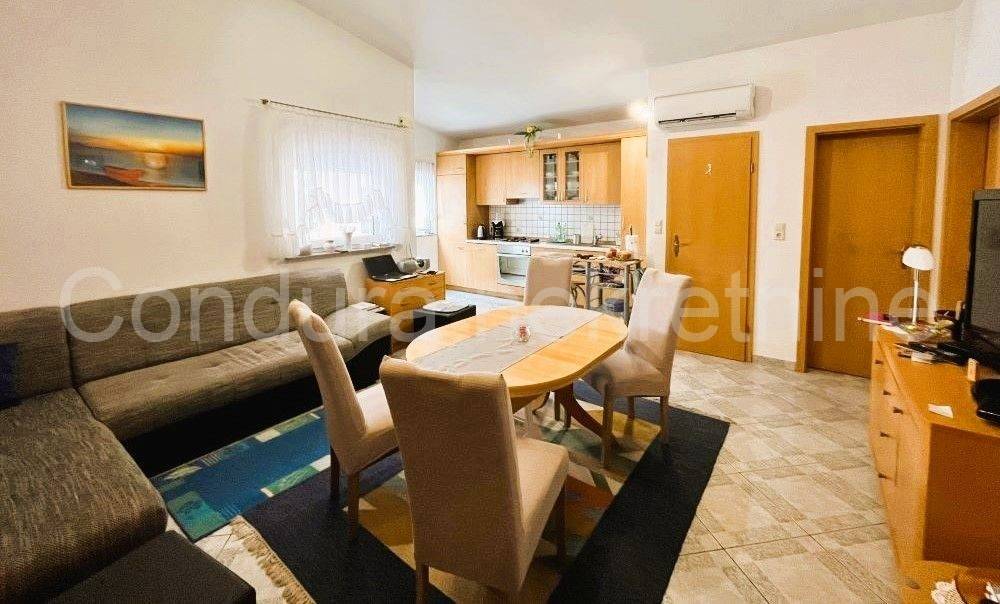 Die größere Wohnung besteht aus Küche mit Wohnzimmer und Esszimmer, zwei Schlafzimmern, Badezimmer und wunderschönen Terrasse mit Blick auf das Meer mit Nettonutzfläche von 80 m2.