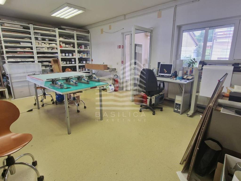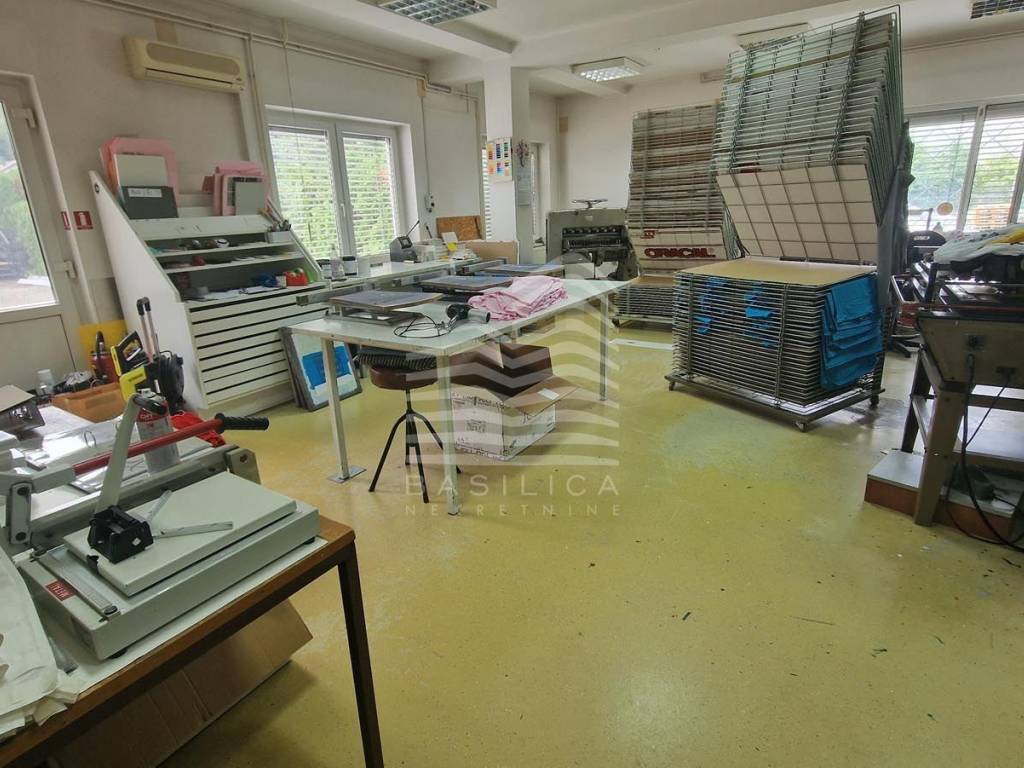 Trenutno tiskara u radu. Građena od porotherm opeke, kombinirano sa betonom, krov od falcanog aluminijskog lima. Ima pvc stolariju, drvenarija uščuvana, centralno etažno plinsko grijanje, klimatizirano. Prizemlje industrijski pod i keramika, kat (ured) laminat. Ima kupaonicu sa wcom i 2 wca za djelatnike. Ima potencijal za skladište, trgovinu, urede ili zastupništvo. Dostupno dostavnim vozila kroz kolni ulaz.