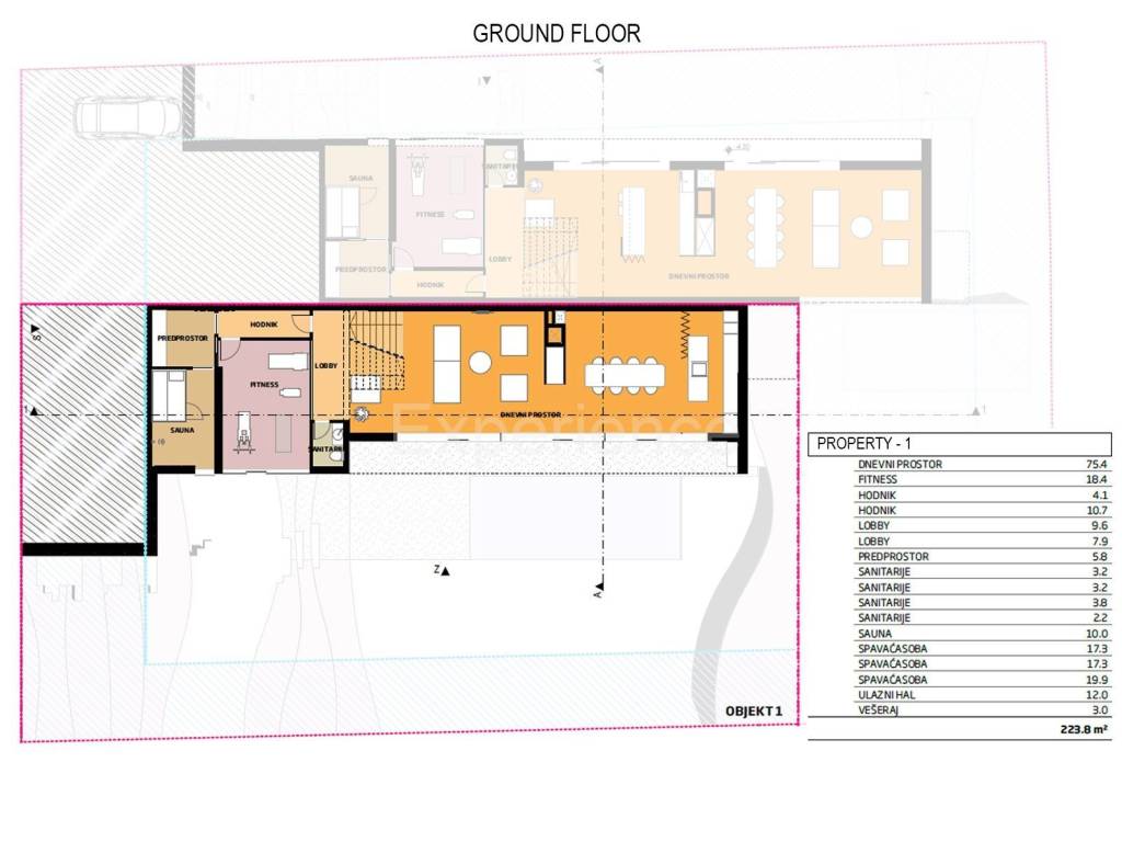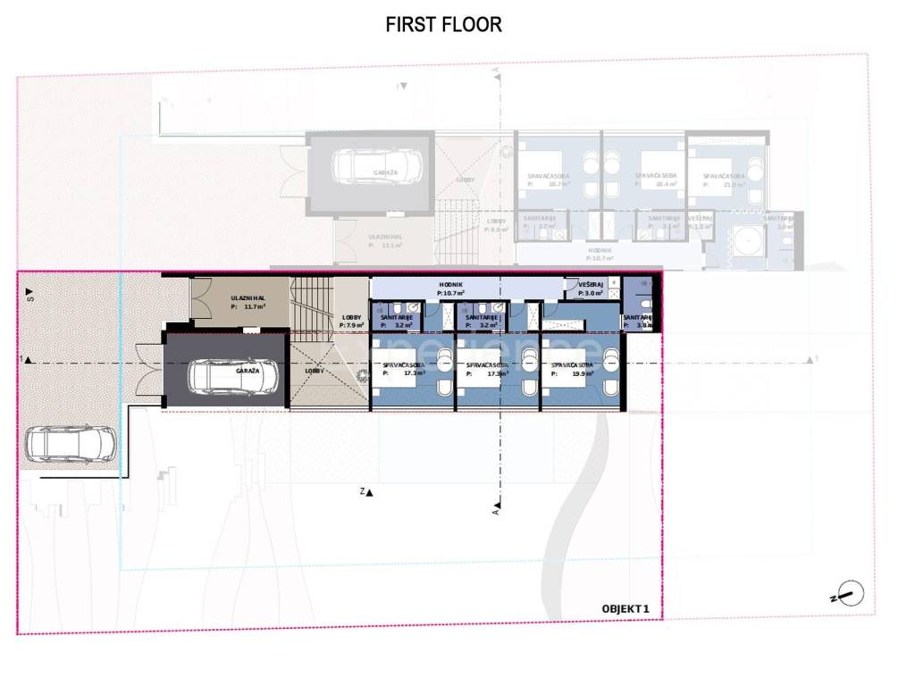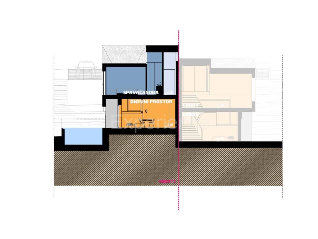 Die Baugenehmigung für eine luxuriöse Doppelhaushälfte mit einer Gesamtfläche von 224 m, verteilt auf zwei Etagen, liegt vor. Das Projekt zeichnet sich durch moderne Architektur, sorgfältig gestaltete Innenräume und große, nach Südwesten ausgerichtete Glasfenster aus, die ein großzügiges Raumgefühl vermitteln und einen Panoramablick auf das Meer bieten.