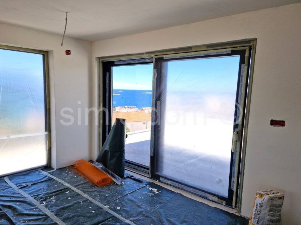 Wir vermitteln den Verkauf einer Wohnung in einem modernen Neubau in einer äußerst ruhigen Straße in Primosten, jedoch nur 10 Gehminuten von allen Annehmlichkeiten und dem Strand entfernt, d. h. 300 Meter Luftlinie von der kristallklaren Adria und 900 Meter Fußweg vom berühmten Kieselstrand in Primosten. Das Gebäude besteht aus fünf modernen Wohnungen. Die Penthouse-Wohnung mit der Bezeichnung S5 ist zweistöckig und befindet sich im zweiten Stock. Sie verfügt über eine Nettonutzfläche von 92 m inklusive aller Nebenräume. Die Wohnfläche der Wohnung beträgt 61,79 m und verfügt über eine 70 m große Terrasse mit herrlichem Meerblick. Im Untergeschoss befinden sich zwei Schlafzimmer, eines davon mit eigenem Bad, ein weiteres Badezimmer und Zugang zu einer überdachten Terrasse. Eine Innentreppe führt ins Obergeschoss, wo sich eine geräumige Küche mit Ess- und Wohnzimmer in einem offenen Raum befindet. Diese Etage ist auf drei Seiten von Terrassen mit einer Gesamtfläche von 66,03 m umgeben, die viel Licht und Möglichkeiten zum Genießen im Freien bieten, von denen einige überdacht sind. Dieser Neubau ist mit einer Styroporfassade, PVC-Fenstern und elektrisch betriebenen ALU-Rollläden, Fußbodenheizung in den Bädern, Inverter-Klimaanlagen zum Heizen und Kühlen, Sicherheitseingangstüren und hochwertiger Keramik ausgestattet. Diese einzigartige Raumaufteilung schafft einen komfortablen und praktischen Wohnraum, um die wunderschöne Umgebung von Primosten zu genießen. Zur Wohnung gehört außerdem ein im Preis inbegriffener Parkplatz. Die voraussichtliche Fertigstellung ist Sommer 2025.