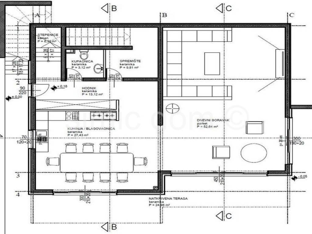 Wir vermitteln den Verkauf einer wunderschönen Villa mit Swimmingpool, die in Duce in der Nähe von Omis gebaut wird. Die Villa wird im Rohzustand, also in fertiggestellter Form, verkauft. Die Villa hat einen wunderschönen Blick auf das Meer und die Insel Brač, befindet sich auf einem 540 m2 großen Grundstück und besteht aus einem Erdgeschoss und einem Obergeschoss mit einer Gesamtbruttofläche von 271 m2. Im Erdgeschoss befinden sich eine Küche, ein Esszimmer und ein geräumiges Wohnzimmer im Open-Space-Konzept, die Zugang zu einer großen Terrasse mit Infinity-Pool bieten. Darüber hinaus gibt es im Erdgeschoss ein Gäste-WC, das zu einem Badezimmer umgebaut werden kann, und einen Abstellraum. Im ersten Stock befinden sich 4 Schlafzimmer, von denen 3 Zugang zu einer Terrasse mit Blick auf das Meer und die Insel Brač haben, 2 Badezimmer und ein Hauswirtschaftsraum, der als Waschküche gedacht ist. Auf der Nordseite des Hauses befindet sich eine Terrasse, die im Sommer Schatten und absolute Privatsphäre bietet und sich zum Grillen und geselligen Beisammensein einlädt. Auf dem Grundstück sind 3 Parkplätze vorhanden. Die Entfernung zum Meer beträgt 150 m. Es besteht die Möglichkeit, mit zusätzlicher Projektdokumentation eine überdachte Terrasse, eine offene Küche, eine Bar, einen Whirlpool und andere Einrichtungen auf dem Dach des Hauses zu schaffen.