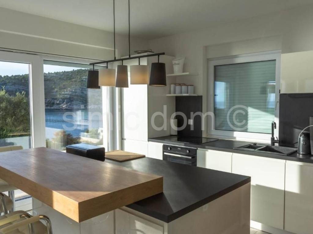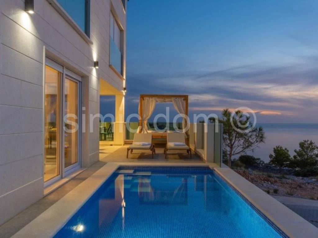 Eine luxuriöse neu gebaute Villa mit Pool steht zum Verkauf, in einer sehr attraktiven Lage in Stivasnica, nur 50 m vom Meer entfernt. Die Villa befindet sich in schöner und ruhiger Lage in zweiter Reihe zum Meer. Das stilvolle Aussehen und Design der Villa und die hochwertigen Materialien, die beim Bau verwendet wurden, vermitteln ein Gefühl von Luxus. Großzügige Terrassen und große Glastüren sorgen den ganzen Tag für Tageslicht und bieten einen wunderschönen Panoramablick auf das Meer und die Umgebung. Neben der Villa befindet sich ein großzügiger 18 m großer Pool, der dieses Anwesen ideal zum Entspannen und Genießen macht. Die Villa besteht aus vier Etagen - Keller, Erdgeschoss, erster und zweiter Stock. Im Untergeschoss befinden sich eine Garage, ein Badezimmer, ein Maschinenraum, ein Fitnessraum, eine Küche und ein Wohnzimmer. Im Erdgeschoss gibt es ein Wohnzimmer, eine Küche mit Esszimmer, ein Badezimmer und zwei große Terrassen. Auf der ersten Etage befinden sich drei Schlafzimmer mit drei en-suite Badezimmern. Auf der zweiten Etage, die als Oase der Entspannung konzipiert ist, befinden sich eine Sauna, ein geräumiges Badezimmer und eine beeindruckende Terrasse mit Whirlpool. Eigentum gültig.