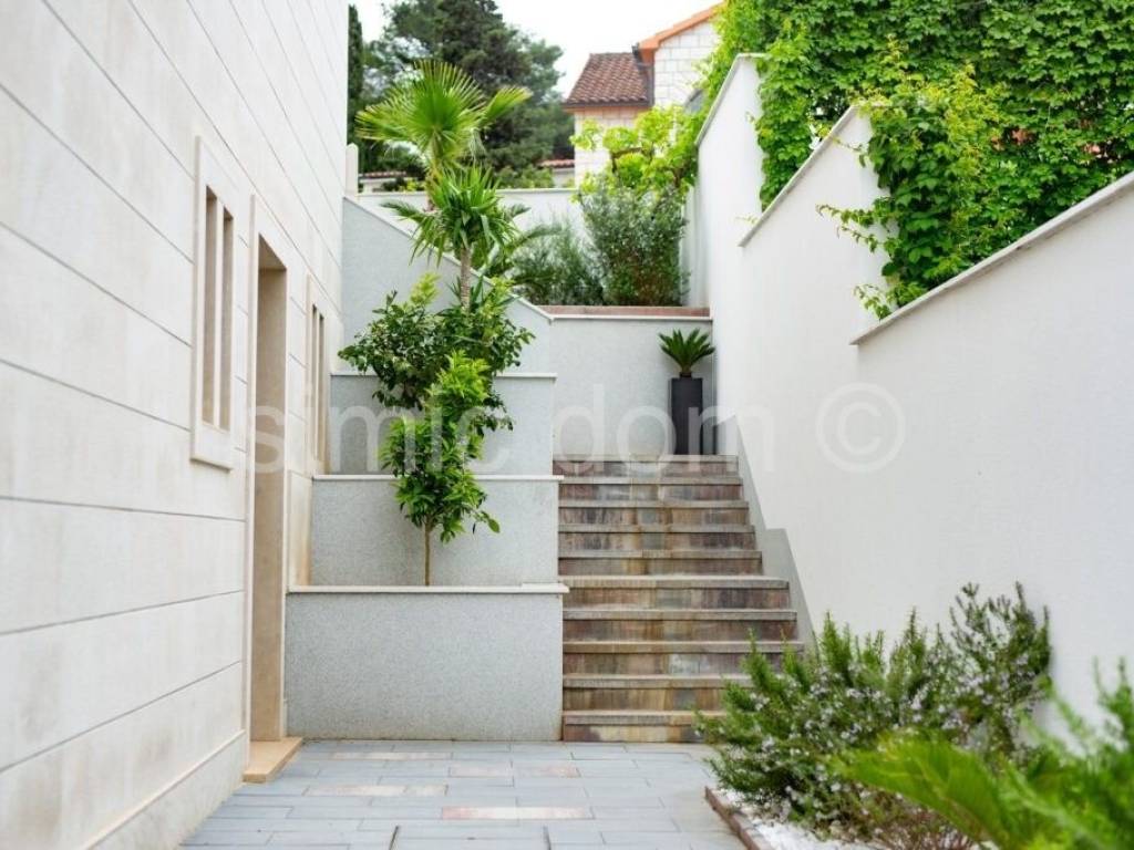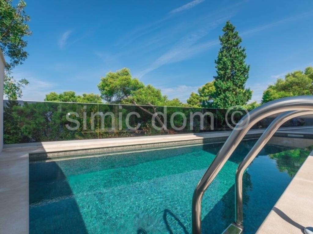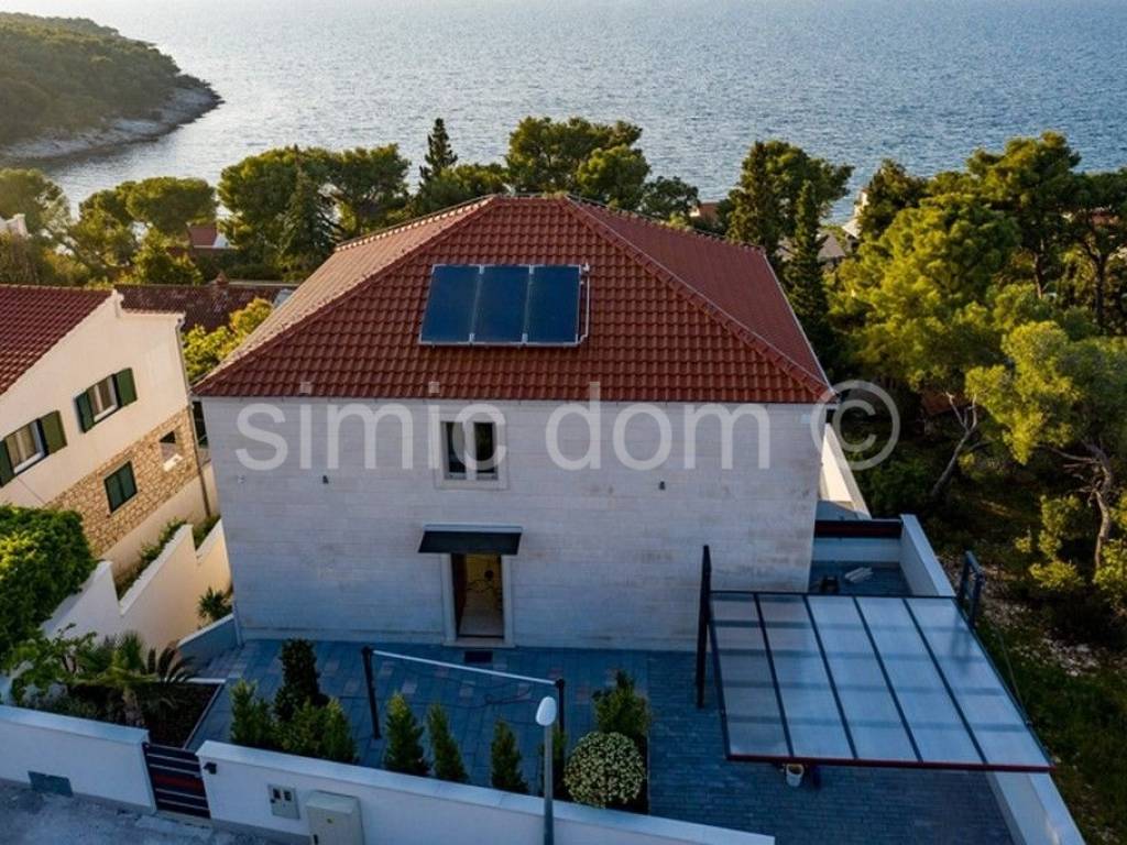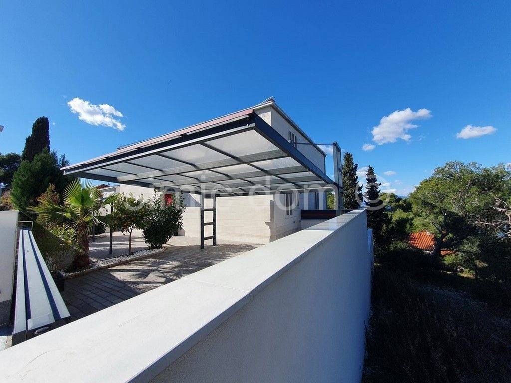 Wir vermitteln den Verkauf einer einzigartigen Villa auf der Insel Brac, gebaut nach dem Prinzip eines Smart Home, mit Videoüberwachung, hochwertigster Ausstattung und einem wunderschönen Swimmingpool, alles inklusive einem unvergesslichen Meerblick. Das Haus hat eine Fläche von 337 m2 und besteht aus einem Erdgeschoss und zwei Obergeschossen und ist mit hohen Decken, großen Glaswänden und geräumigen Räumen geschmückt. Im Erdgeschoss befinden sich eine Eingangshalle, eine Lounge, eine Toilette, ein Schlafzimmer mit Bad en Suite, ein geräumiges Büro und ein Raum mit Ausstattung für die Hausverwaltung (Beleuchtung, Eingangstor, Klimaanlage, Videoüberwachung). Auf dieser Etage befindet sich auch ein Swimmingpool mit großer Terrasse. Auf der ersten Etage befindet sich eine Eingangshalle, ein Gäste-WC, ein Badezimmer, eine Garderobe und ein offener Raum mit Küche, Esszimmer und Wohnzimmer. Auf der zweiten Etage befinden sich zwei große Schlafzimmer mit en-suite Badezimmern und Kleiderschränken, die einen bezaubernden Meerblick bieten.