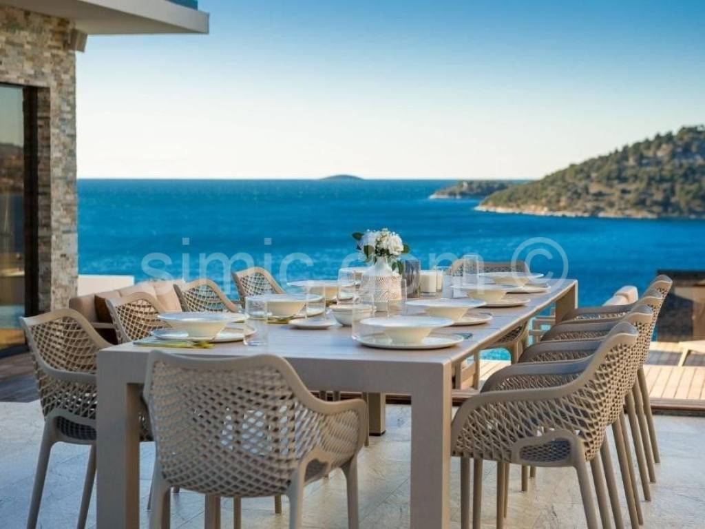 Wir vermitteln beim Verkauf einer wunderschönen, neu gebauten und äußerst luxuriösen Villa in ruhiger Lage, nur 150m vom Meer entfernt. Die Villa hat eine Fläche von 260m2 und befindet sich auf einem Grundstück von 665m2. Es besteht aus einem Erdgeschoss und dem ersten Stock. Das großzügige, helle und sehr luftige Erdgeschoss verfügt über ein Wohnzimmer mit Küche und Essbereich, ein Badezimmer und einen Wellnessbereich mit Sauna und Bad. Es gibt auch eine Toilette, eine Waschküche und einen Technikraum. Der wahre Vorteil dieser Etage ist die erstaunliche, wunderschön dekorierte Terrasse von 110 m2, die einen Überlaufpool mit Sonnendeck umfasst. Die Terrasse bietet einen unvergesslichen Blick auf das Meer und die Umgebung. Im ersten Stock befinden sich vier Schlafzimmer mit angeschlossenen Badezimmern, und jedes Zimmer bietet die gleiche Aussicht. Die Villa verfügt auch über einen Parkplatz für drei Autos als Teil eines sorgfältig gepflegten Gartens mit typisch mediterraner Vegetation. Dies ist ein hervorragend ausgestattetes und geschmackvoll eingerichtetes Anwesen und alle Möbel sind maßgefertigt. Aufgrund der Bauqualität, der schönen Lage und der fantastischen Aussicht ist diese Villa ideal als Zweitwohnsitz oder als Immobilie, um ein tolles Einkommen zu erzielen. Besitz ordentlich.