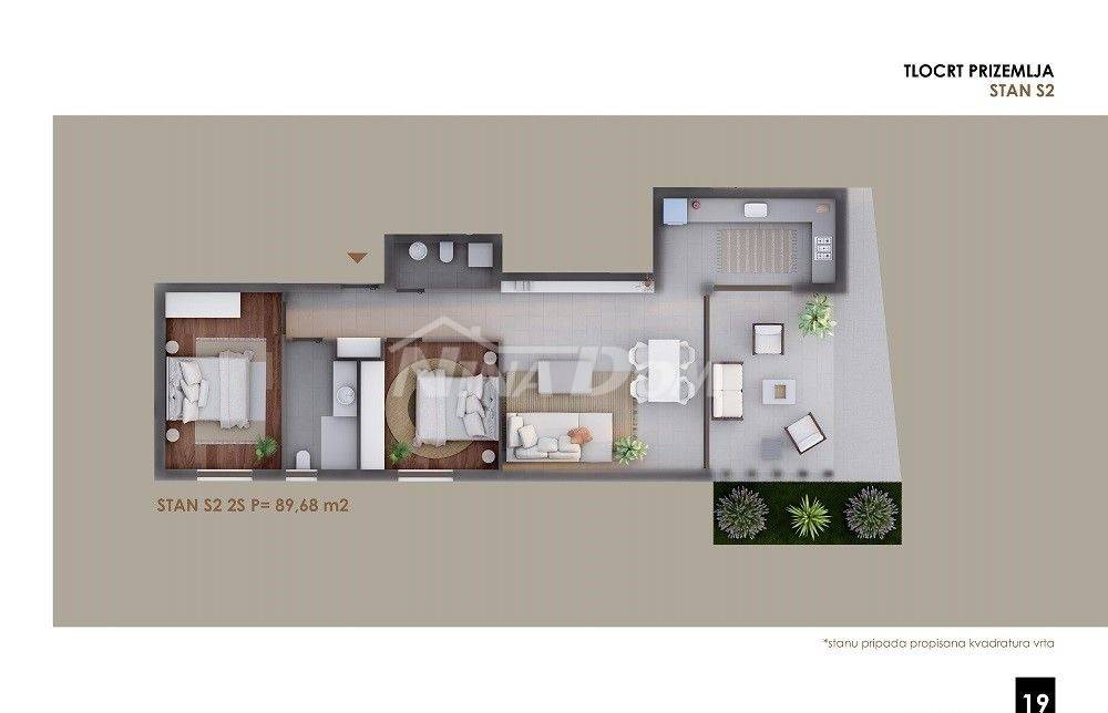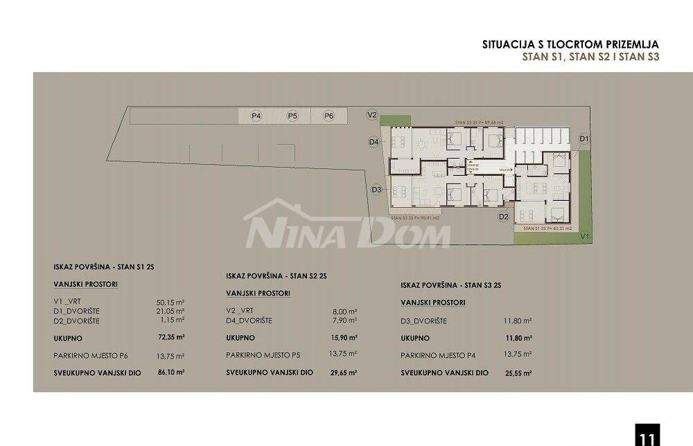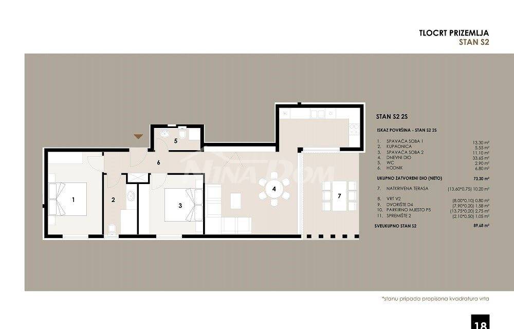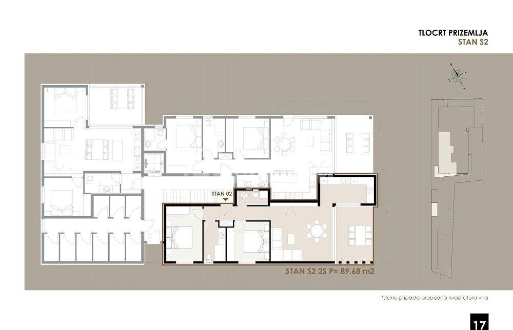 Apartman S2 smješten je u prizemlju i sastoji se od hodnika, dvije kupaone, dvije spavaće sobe, kuhinje s dnevnim boravkom, wc, natkrivenom terasom, ostava (spremište br,1) 2.20 m2.