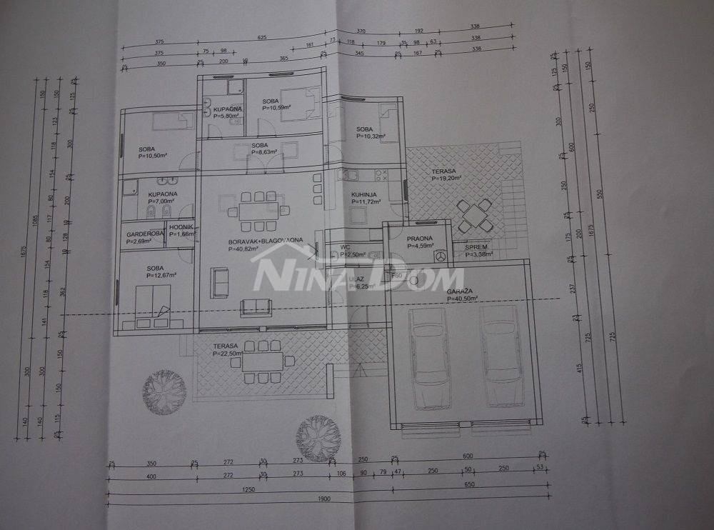 spavaća soba s kupaonicom i garderobom, dodatne tri spavaće sobe i kupaonica. Garaža 40.50 m2.