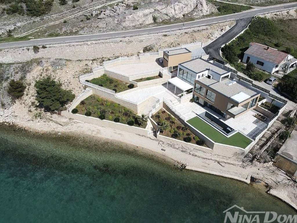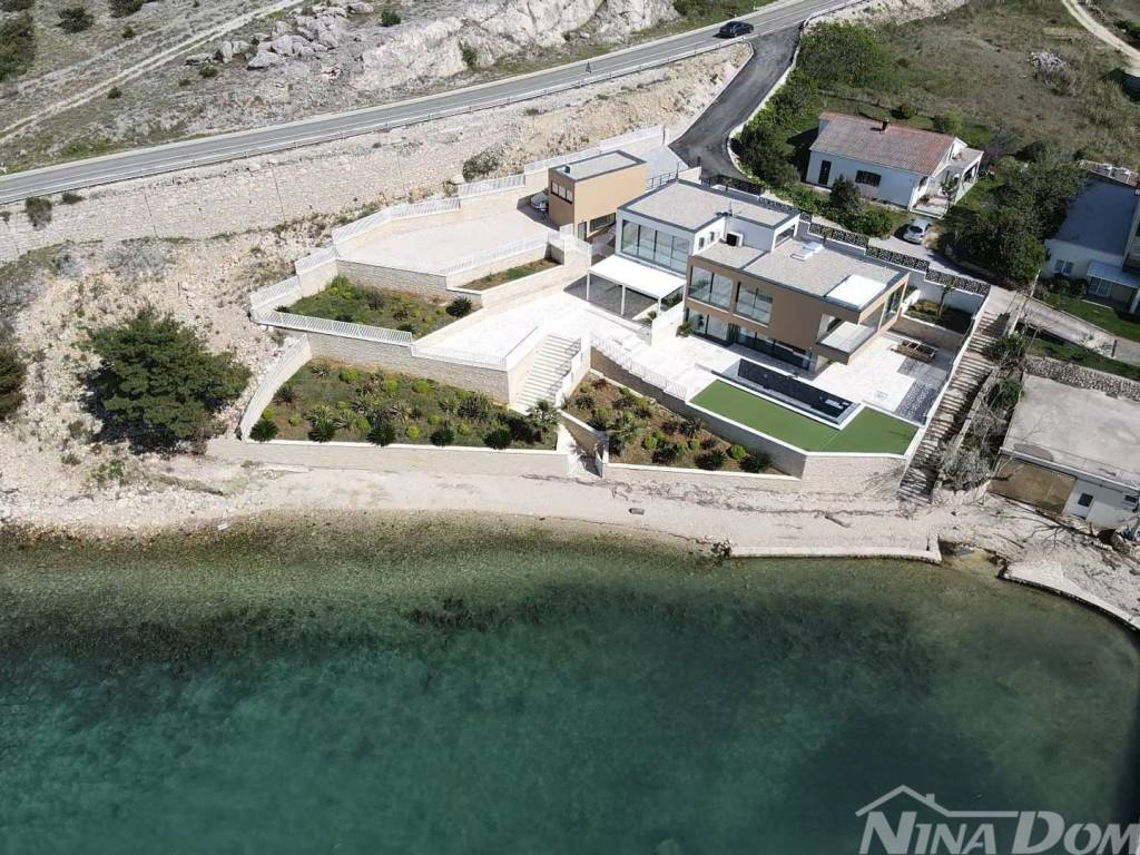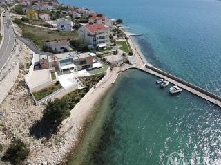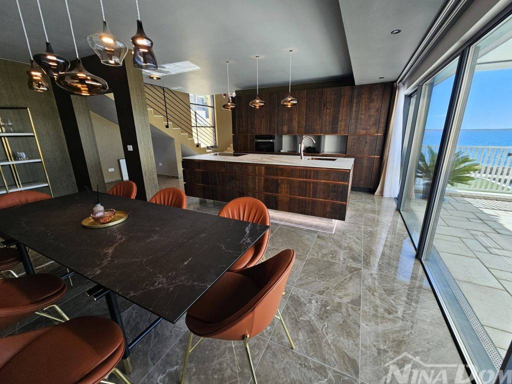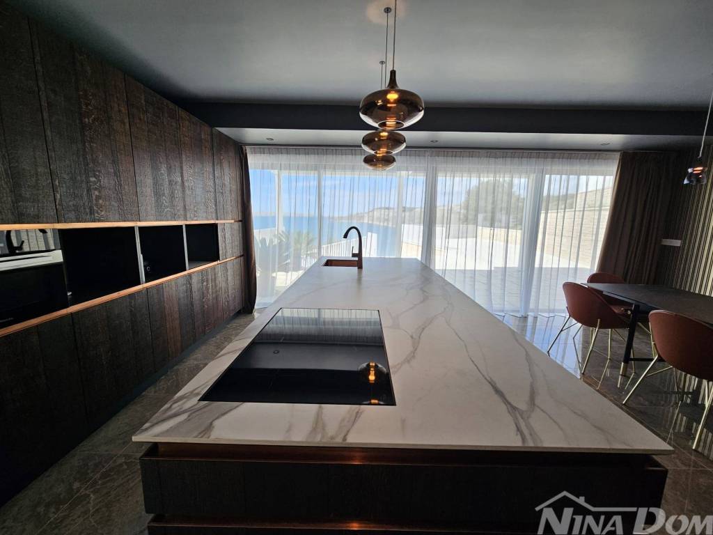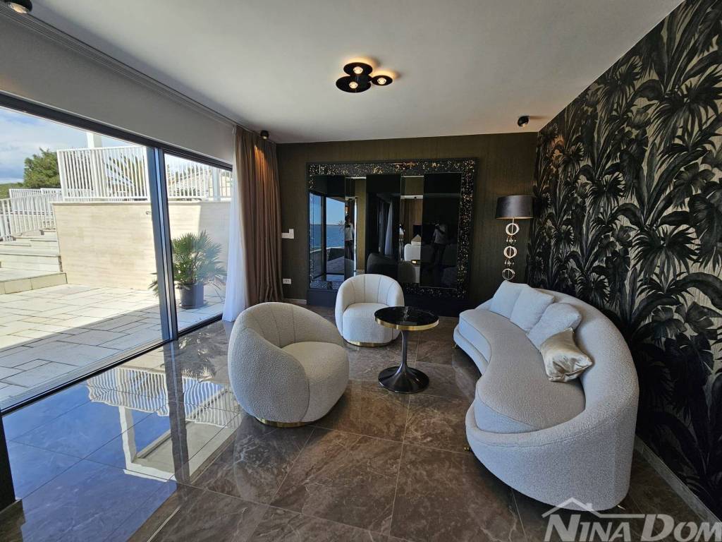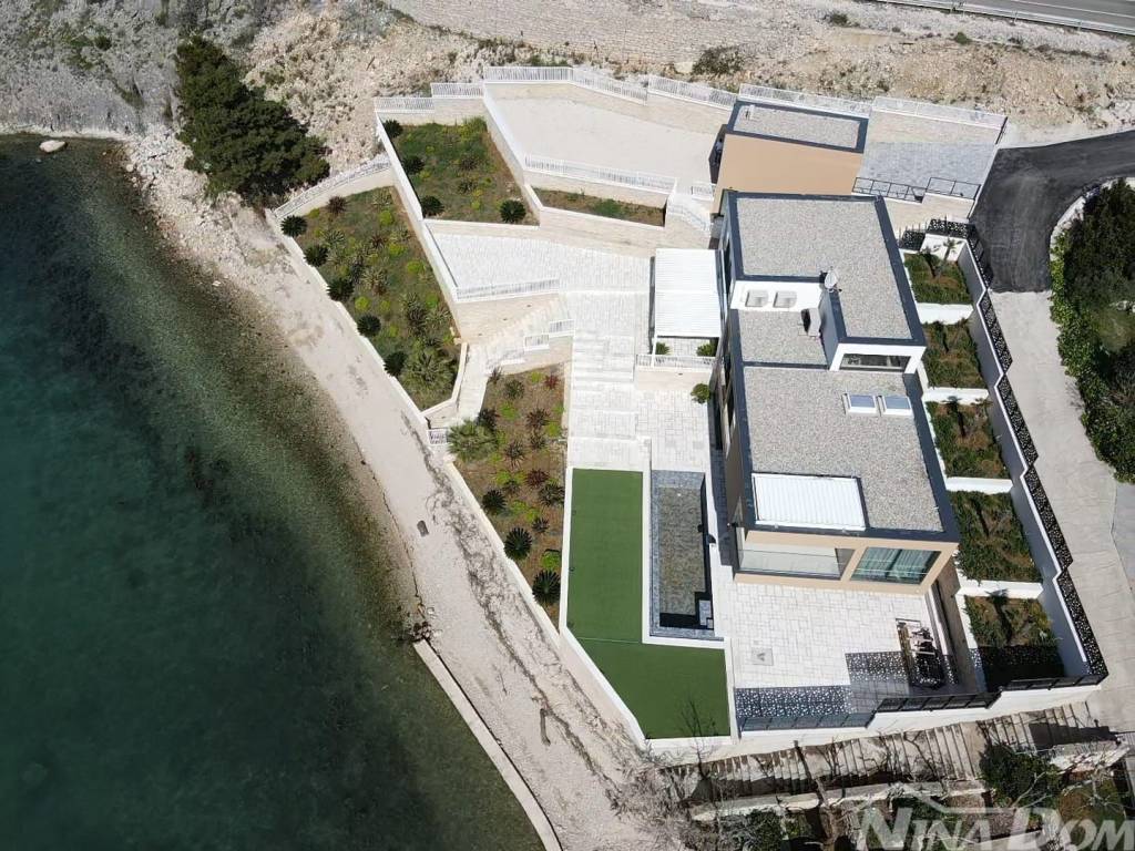 Prodaje se dizajnerska vila na samoj plaži.Kuća je građena od visoko kvalitetnih,probranih materijala.Cortizo automatska alu stolarija,auto atske zavjese,Versace pločice,tapete itd,Bang and Olufsen iitd.Sastojj se od dva odvojena dijela.Prvi dio se sastoji od garaže i studio apartmana,namijenjenih za poslugu ili goste.Drugi ,glavni dio se sastoji od atraktivnog ulaza,hodnika,stubišta, iz kojeg se pruža pogled na prekrasno ,razvedeno stubište.U prizemlju se nalaze dnevni boravak,prostor za relaksaciju,wc,praona rublja sa tehničkim dijelom,te kuhinja sa blagovaonom.Valja napomenuti da se iz svih prostorija pruža prekrasan pogled na očaravajući krajolik.Na katu se nalaze četiri spavaće sobe od kojih,dvije sa vlastitim kupatilom,dok ostale dvije dijele treće kupatilo.S vanjske strane se nalazi ostava za vrtni namještaj te bazenska pomagala.Na prostranoj okućnici se nalazi bazen sa tušem.Sa prekrasne terase se spušta vlastitim stepenicama na prekrasnu plažu i malu lučicu kojoj se nalazi privatni vez za brodicu.Za sva dodatna pitanja i obilazak,stojimo vam na raspolaganju.