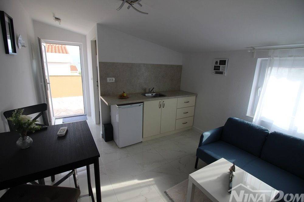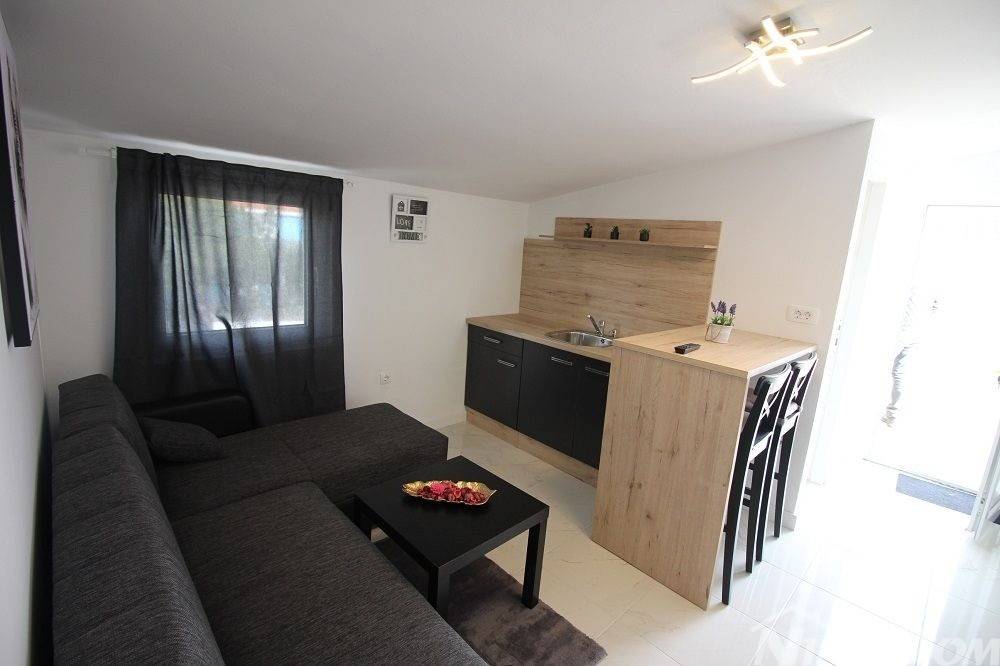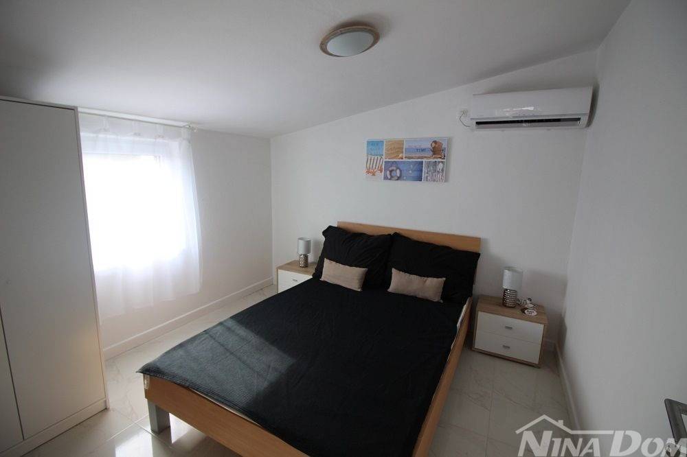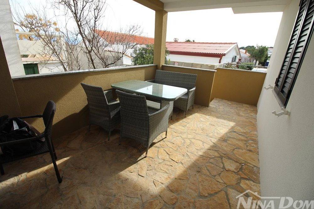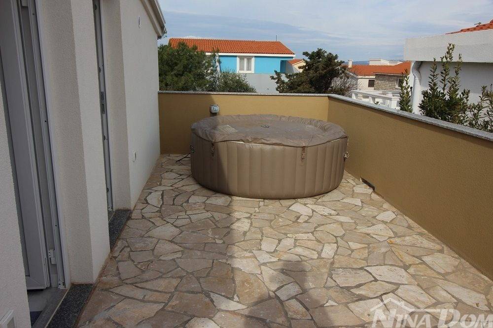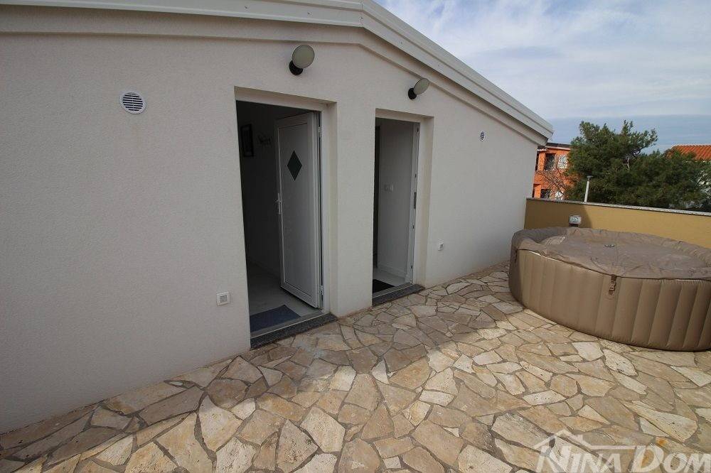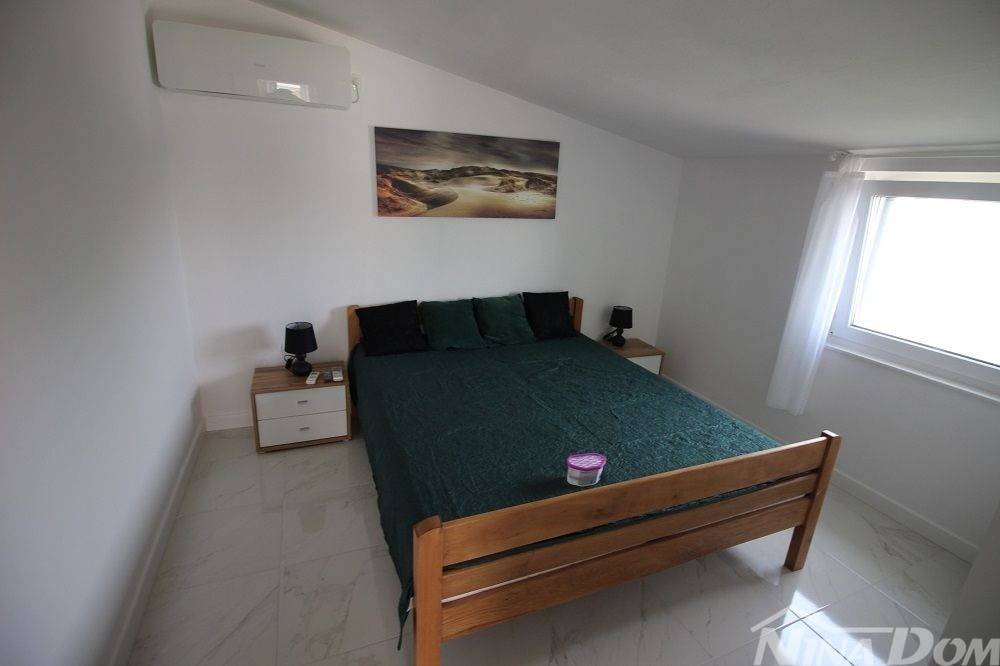 Na katu: terasa s pogledom na more i Velebit, dva apartmana od kojih svaki ima jednu spavaću sobu, kuhinju s dnevnim boravkom, kupaona.