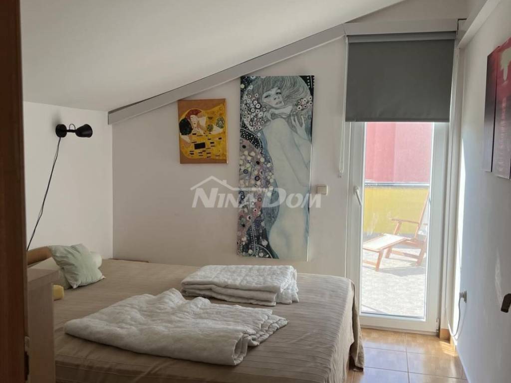 Vanjske stepenice za kat: natkrivena terasa s prednje strane, kuhinja s dnevnim boravkom, kupaona, dvije spavaće sobe s izlazom na zadnju terasu koja se nalazi iznad spremišta. Okućnica funkionalna s parkirnim mjestima s svake strane objekta.
