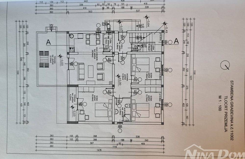 Nekretnina je smještena na velikom zemljištu 715 m2. Sama nekretnina veličine je 220 m2 stambene površine i garaža 35 m2.