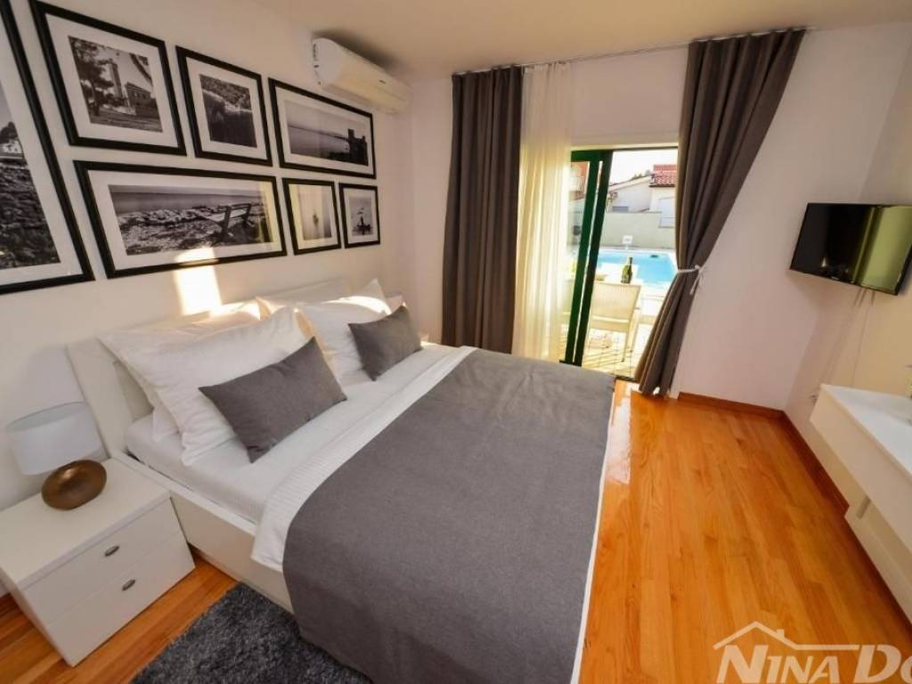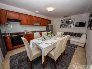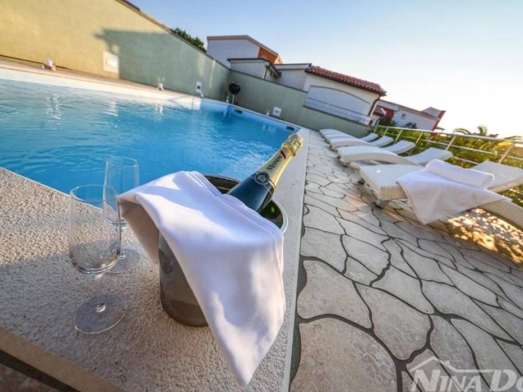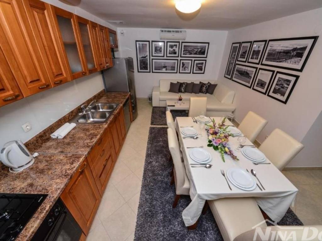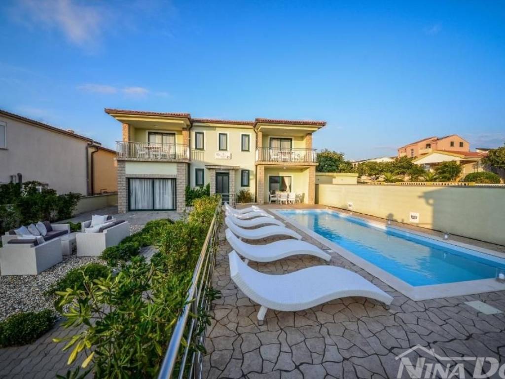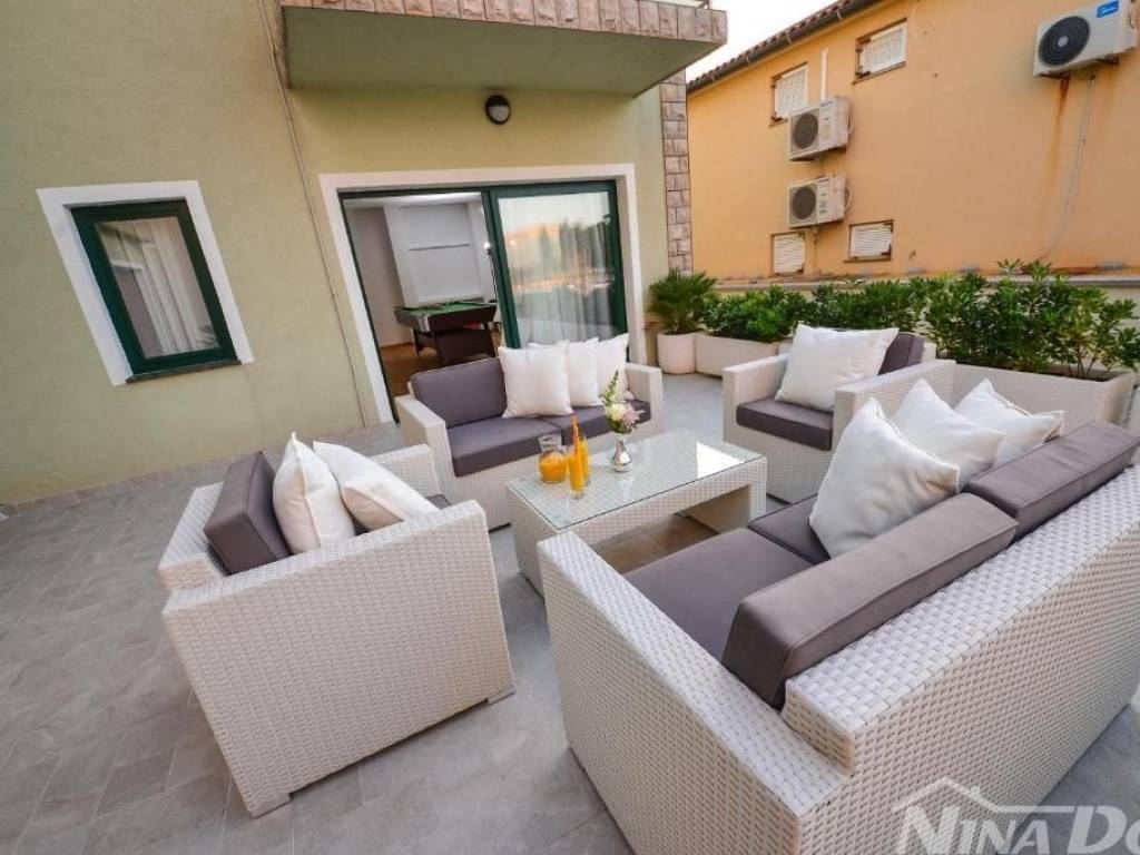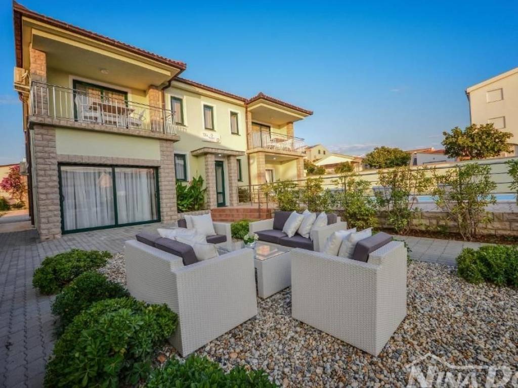 Prodaje se luksuzna villa na top lokaciji, 2 red do mora i uređene plaže na otoku Viru. Sastoji se od tri zasebna stana, koji sadrže sedam spavaćih soba, pet kupatila, tri dnevna boravka sa blagovaonamai i kuhinjama, prostorija za fitness te prostorije za zabavu. Okućnicu kuće krasi prekrasno uređeno dvorište sa bazenom i mjestom za odmor. U dvorištu se nalazi i garaža.Grinjanje je izvedeno uz pomoć klima jedinica. Prekrasan pogled na more proteže se sa dvije velike terase i četiri balkona.