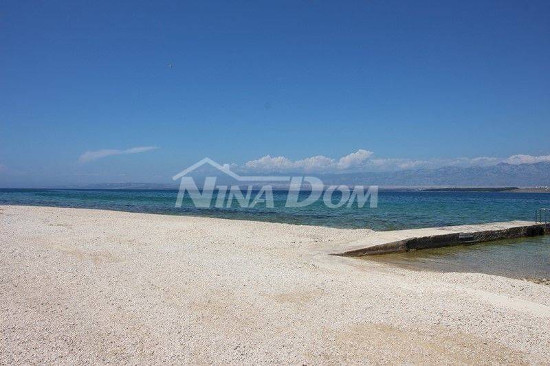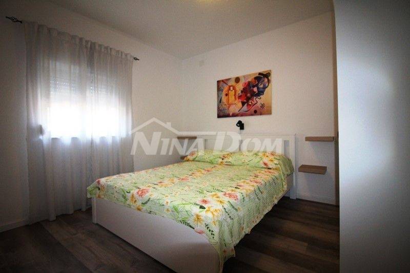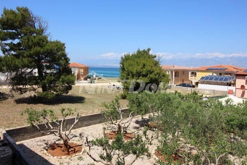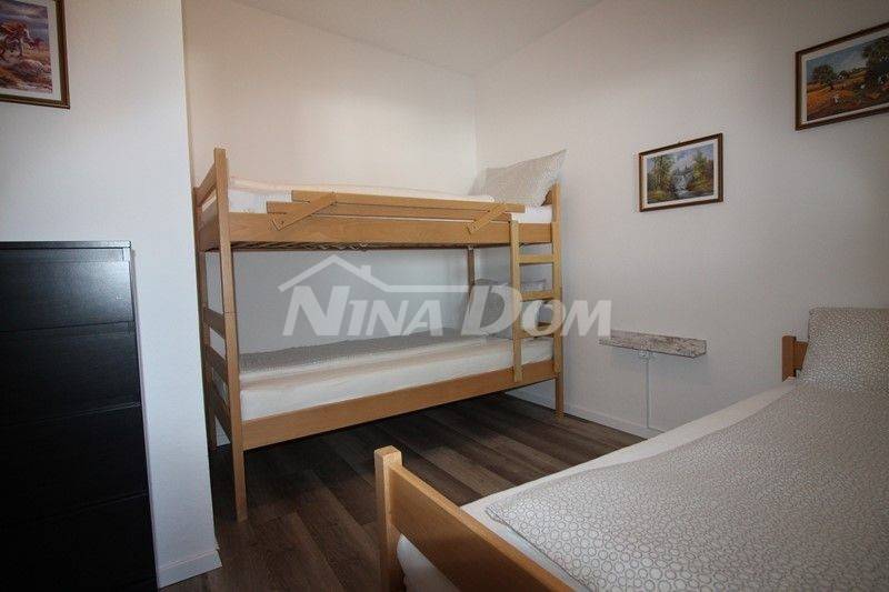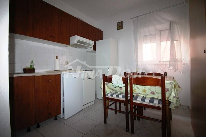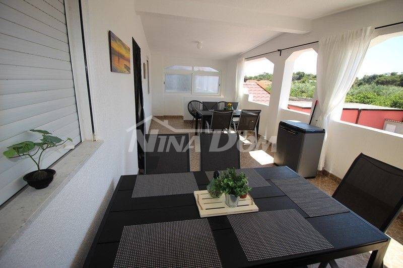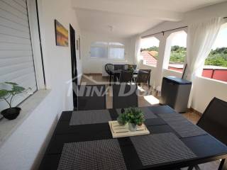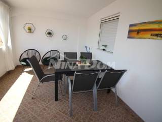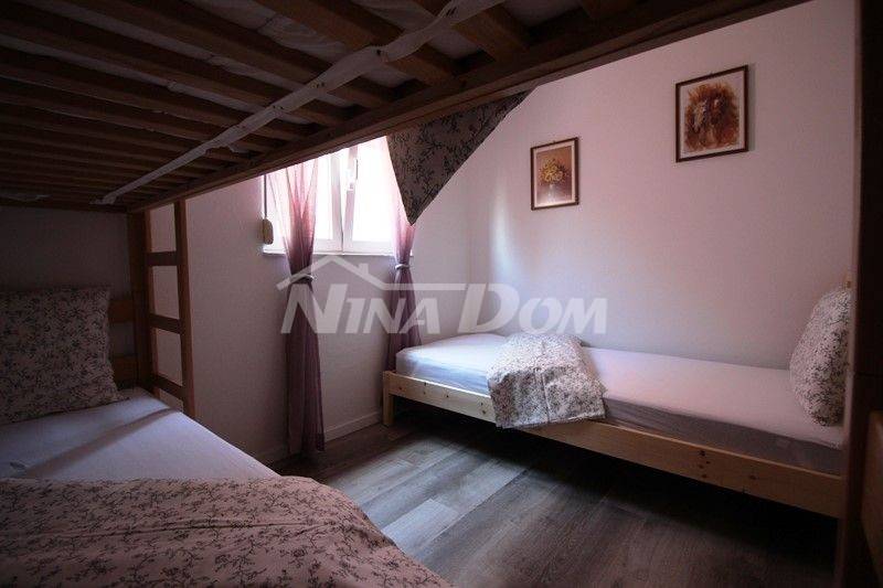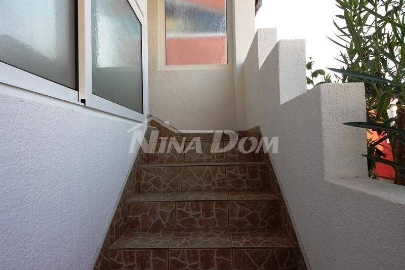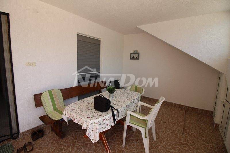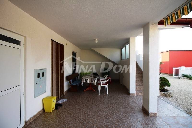 Kuća dvojnica koja se sastoji od tri stambene jedinice. Prizemlje posjeduje dvije spavaće sobe, kuhinju s dnevnim boravkom, hodnik, kupaonicu i terasu. Garaža 20 m2. Vanjske stepenice za kat i na katu dva odvojena apartmana koji svaki ima dvije spavaće sobe, kuhinju, kupaonu i terasu. Nekretnina je kompletno uređena. Udaljena je od mora i plaže svega 100 metara. Nalazi se u mirnoj i slijepoj ulici bez prevelike buke i gužve.