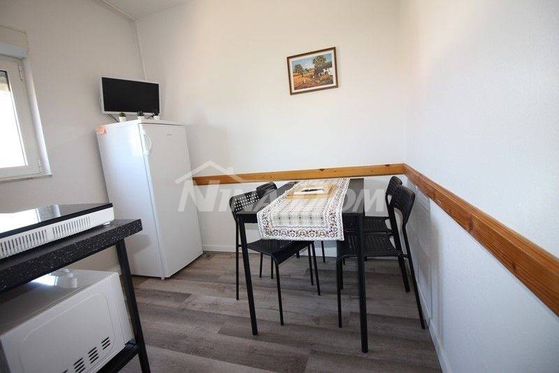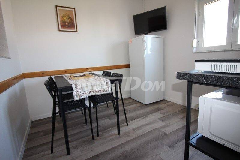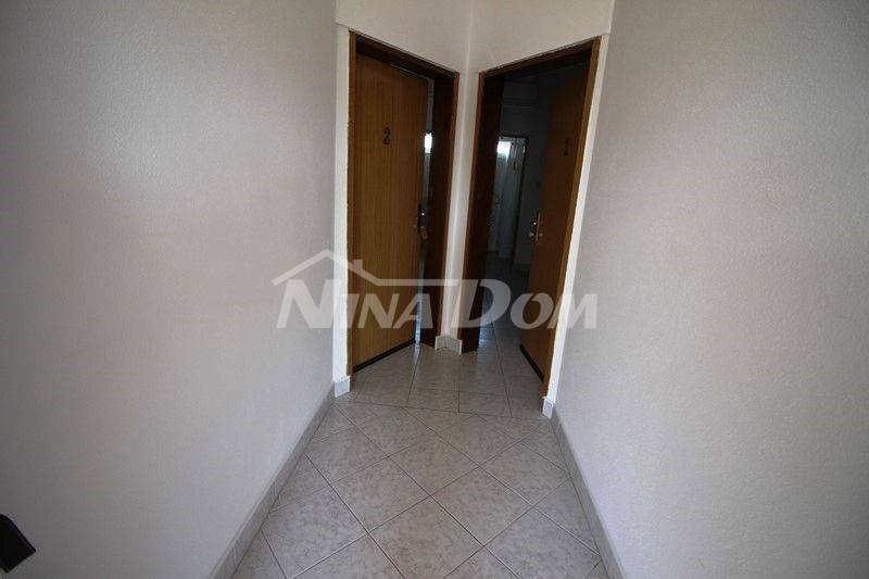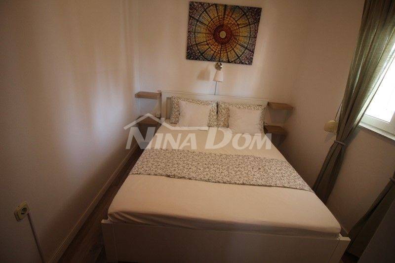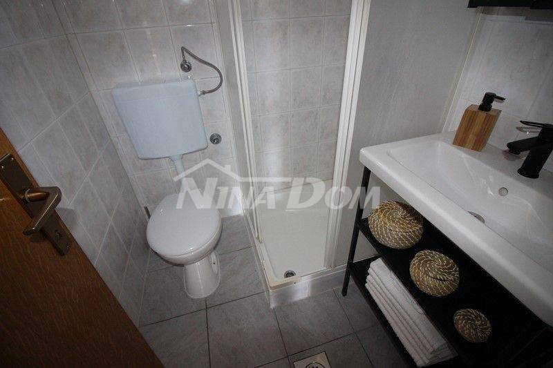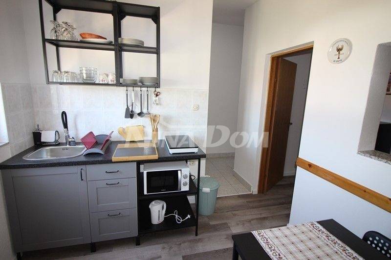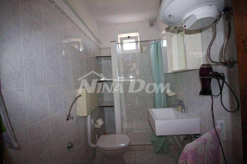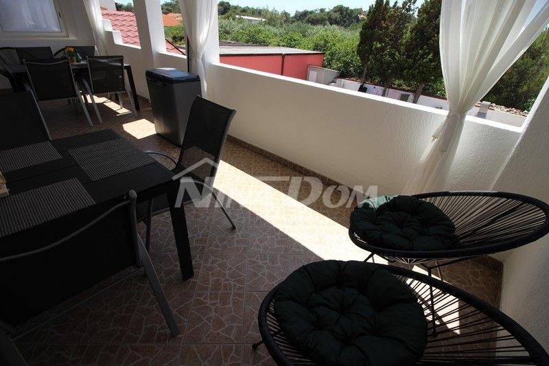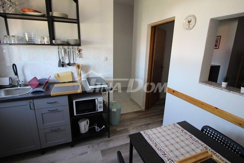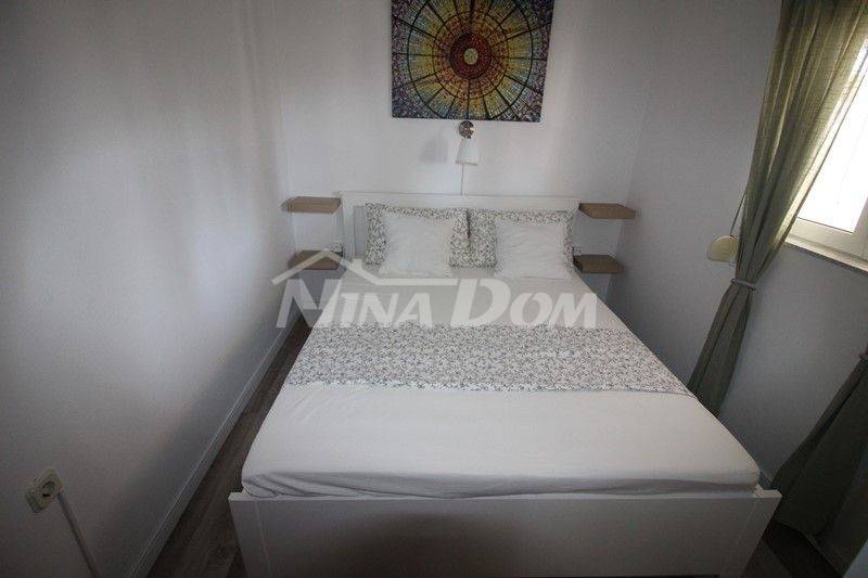 Kuća dvojnica koja se sastoji od tri stambene jedinice. Prizemlje posjeduje dvije spavaće sobe, kuhinju s dnevnim boravkom, hodnik, kupaonicu i terasu. Garaža 20 m2. Vanjske stepenice za kat i na katu dva odvojena apartmana koji svaki ima dvije spavaće sobe, kuhinju, kupaonu i terasu. Nekretnina je kompletno uređena. Udaljena je od mora i plaže svega 100 metara. Nalazi se u mirnoj i slijepoj ulici bez prevelike buke i gužve.