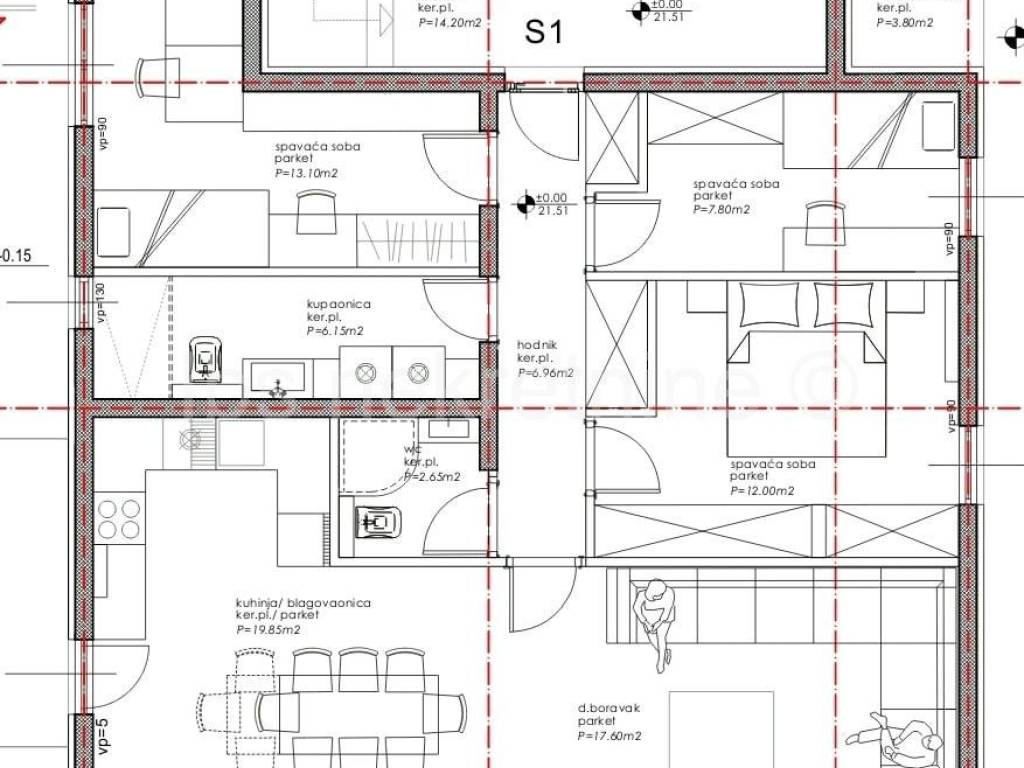 The apartment with a garden is located on the ground floor of the building, the net living area is 95 m2 + garden 50 m2, and the layout of the rooms is as follows: