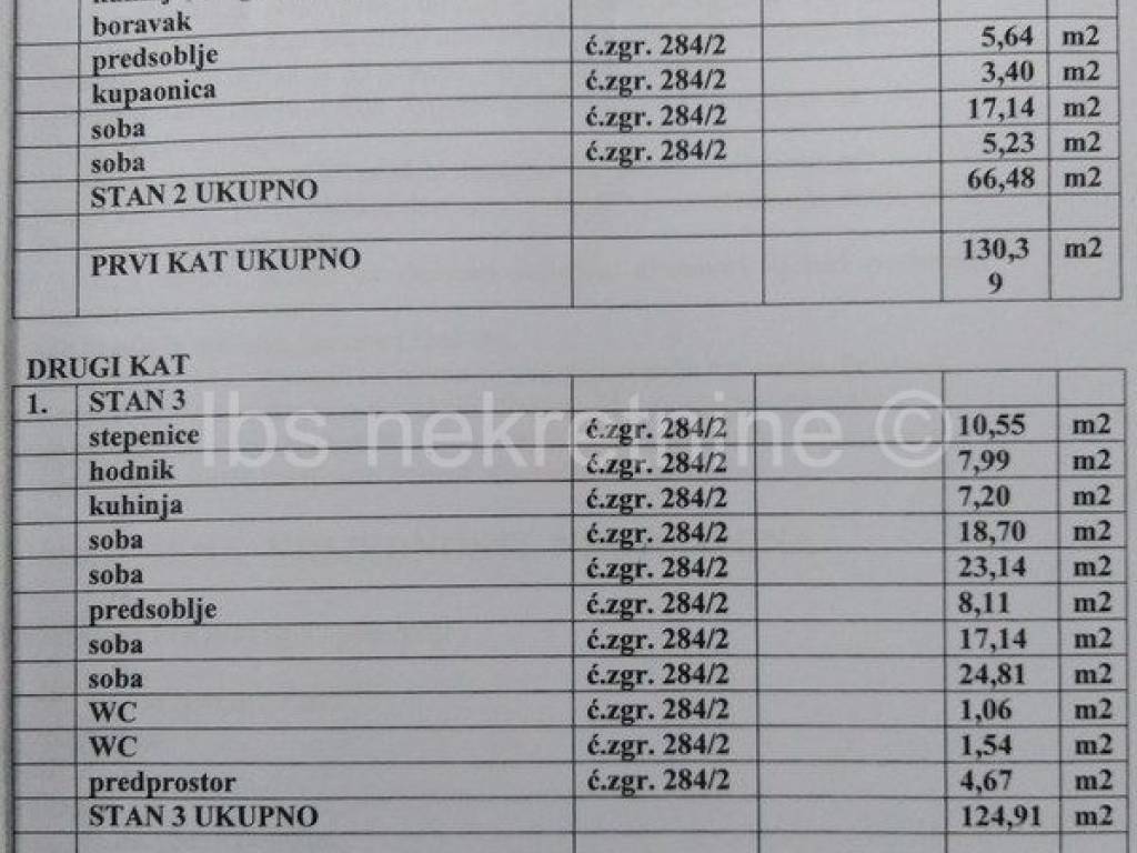 Objekt se nalazi u širem centru grada,priključen je na slijedeće komunalne sustave:vodovod,kanalizacija i el.struja.Građevina je stambeno poslovna katnosti P+2+K.U prizemlju objekta su dva poslovna prostora koja imaju ulaz s ulice,te 3 ostaves ulazom iz dvorišta.Na katu su dvije stambene jedinice.Stan 1 ima ulaz iz dvorišta preko vanjskih jednokratnih stepenica i verande.Stan 2 ima direktan ulaz iz dvorišta.Na drugom katu je jedna stambena jedinica.Pristup u stan je preko vanjskih stepenica i verande,a zatim preko unutrašnjih dvokrakih stepenica.Iz stana 2 je osiguran ulaz u prostor krovišta preko unutrašnjih drvenih zavojitih stepenica.Nosiva konstrukcija zgrade je od kamena,zidovi debljine 60 cm.Međukatna konstrukcija je drvena.Krovna instrukcija je drvena,krov na više voda,pokrov crveni crijep.Podovi su ovisno o prostoriji,obloženi keramičkim pločicama i drvetom.Pregradni zidovi su polumontažni drveni,a u stanu 3 je izvršena adaptacija pa su zidovi od gips ploča.Unutrašnji i vanjski zatvori su elementi stolarije,a vanjski zatvori poslovnih prostora su elementi bravarije.Fasada zgrade je nuređena,kamena i žbukana.Poslovni prostor 1 je u funkciji,poslovni prostor 2 trenutno nije u funkciji.Stanovi 1 i 2 su useljeni prosječno i održavani.Stan 3 je nezseljen duži period,neodržavan i potrebni su dodatni radovi da bi se doveo u stanje useljivosti.Starost objekta je cca 80 g.Objek je možda najbolje preurediti u starački dom ili apartmane ili prodaju stanova.