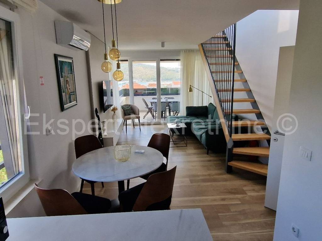 Trogir, luxuriöses Penthouse 70 m2 + 75 m2 Dachterrasse im zweiten (letzten) Stock eines neueren Gebäudes (2021) mit Meerblick. Die Wohnung ist langfristig vermietet und besteht aus einem Flur, zwei Schlafzimmern, eines davon mit eigenem Balkon, einem Badezimmer, einer kleinen Toilette, einer Küche, einem Esszimmer und einem Wohnzimmer, sowie einer großen Loggia ( 15m2) und Innentreppe, die zu einer großen Dachterrasse (75m2) führt, die einen freien Blick auf das Meer und die Umgebung bietet.Die Wohnung verfügt über Fußbodenheizung, Klimaanlage in jedem Zimmer, begehbare Dusche, voll ausgestattete Küche, hochwertige Keramik und Parkett, Einbruch- und Brandschutztüren, etc... Die Wohnung ist hervorragend eingerichtet und komplett mit neuen und modernen Möbeln mit allen Geräten ausgestattet Parkplätze gehören dazu. Es liegt nur 600 m vom Meer und dem Strand und 1,2 km vom Stadtzentrum entfernt. Gute Anbindung.Für weitere Informationen wenden Sie sich bitte an die Agentur.