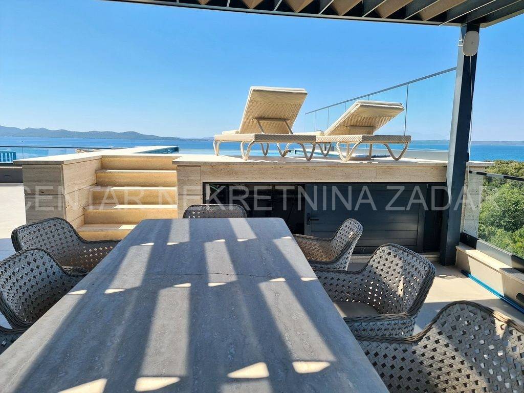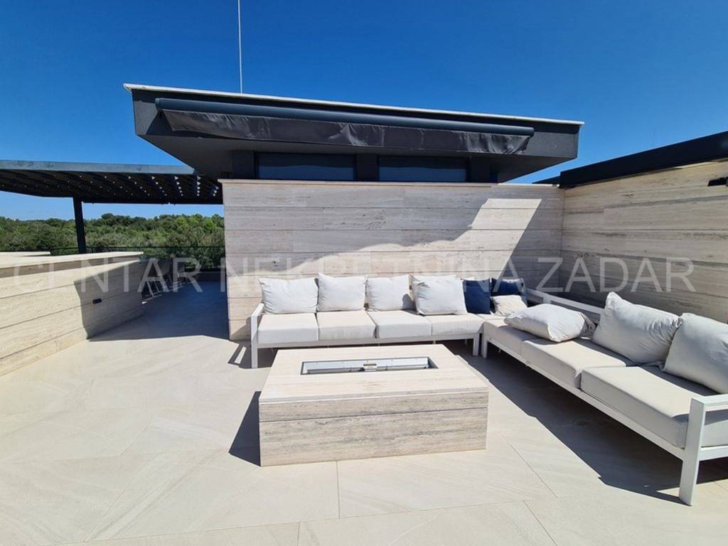 Posebnost stana je velika krovna terasa na koju se može pristupiti spiralnim stepenicama s terase stana ili preko stubišta zgrade. Terasa je potpuno opremljena za ugodan boravak više osoba koji iz svakog dijela mogu uživati u panoramskom pogledu na more i otoke. Na terasi su grijani bazen od oko 33 m sa sunčalištem, sauna, jacuzzi, tuš te velika garnitura za sjedenje. Na dijelu natkrivenom pergolom nalazi se stol za objedovanje i vanjska kuhinja. Ukupna tlocrtna površina stana zajedno s krovnom terasom i pripatcima iznosi 327,17 m.