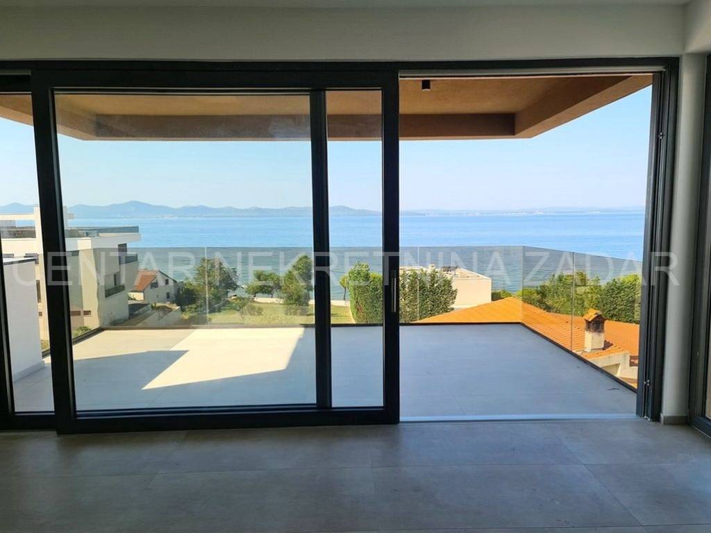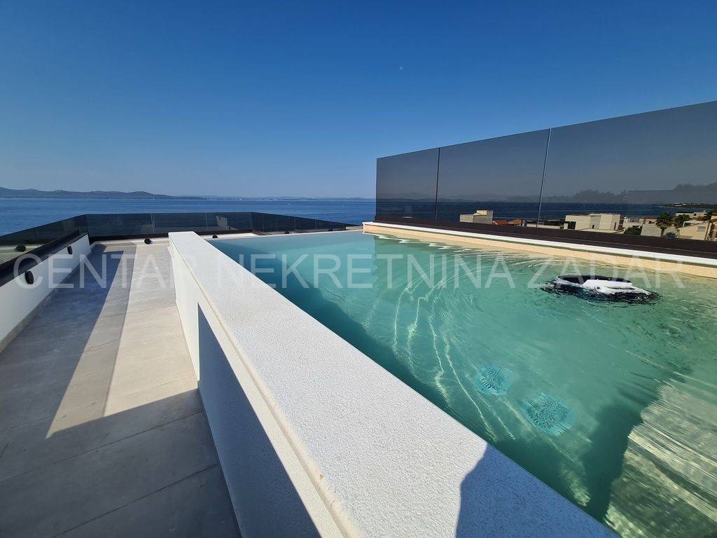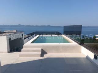 Luxury apartments for sale in a new building in Kožino, 100 m away from the sea. In the building there are four apartments: on the ground floor there is an apartment with a garden and a swimming pool, on the first floor there are two apartments, and on the second floor there is a penthouse with a roof terrace and a swimming pool. In the building there is an elevator.