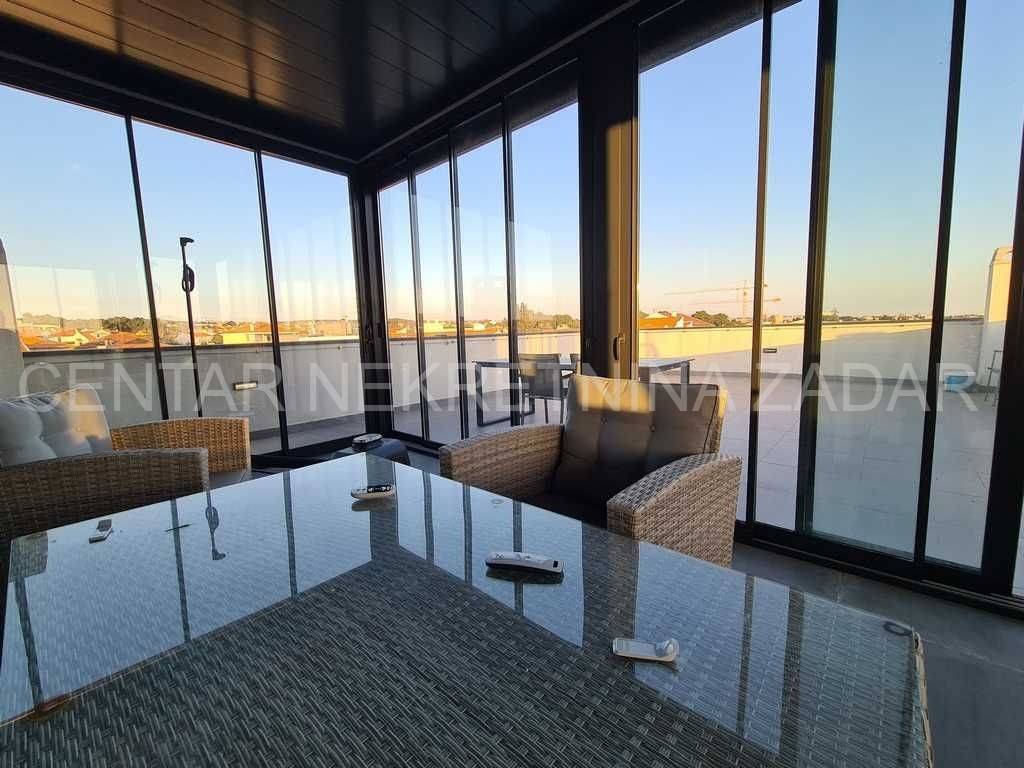 The apartment is located on the second floor of a newer building with only seven residential units. The interior living area of 59.77 m consists of an entrance area, a spacious living room with kitchen and dining area, a hallway, two bedrooms and two bathrooms (one of them is in the room). The living room opens onto a 10.28 m loggia with stairs leading to a spacious roof terrace. The loggia is closed with a glass panel that is raised and lowered by remote control and is comfortable to stay in all year round.