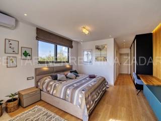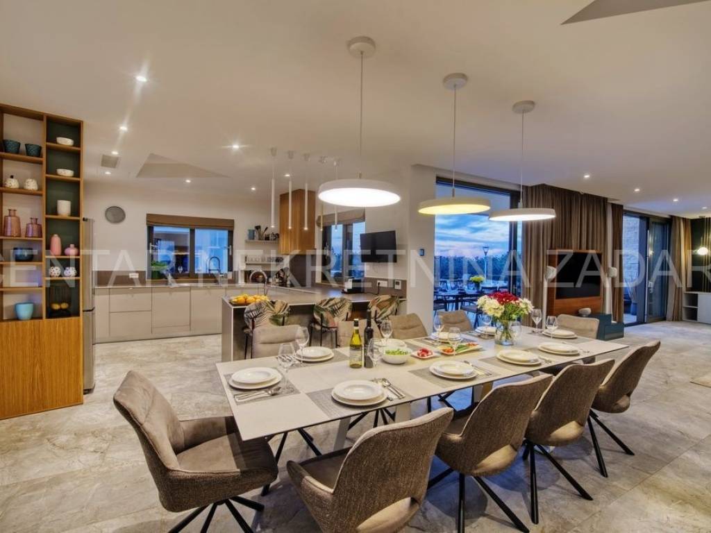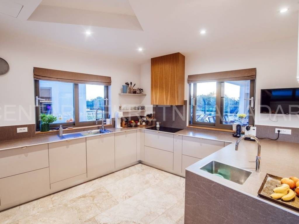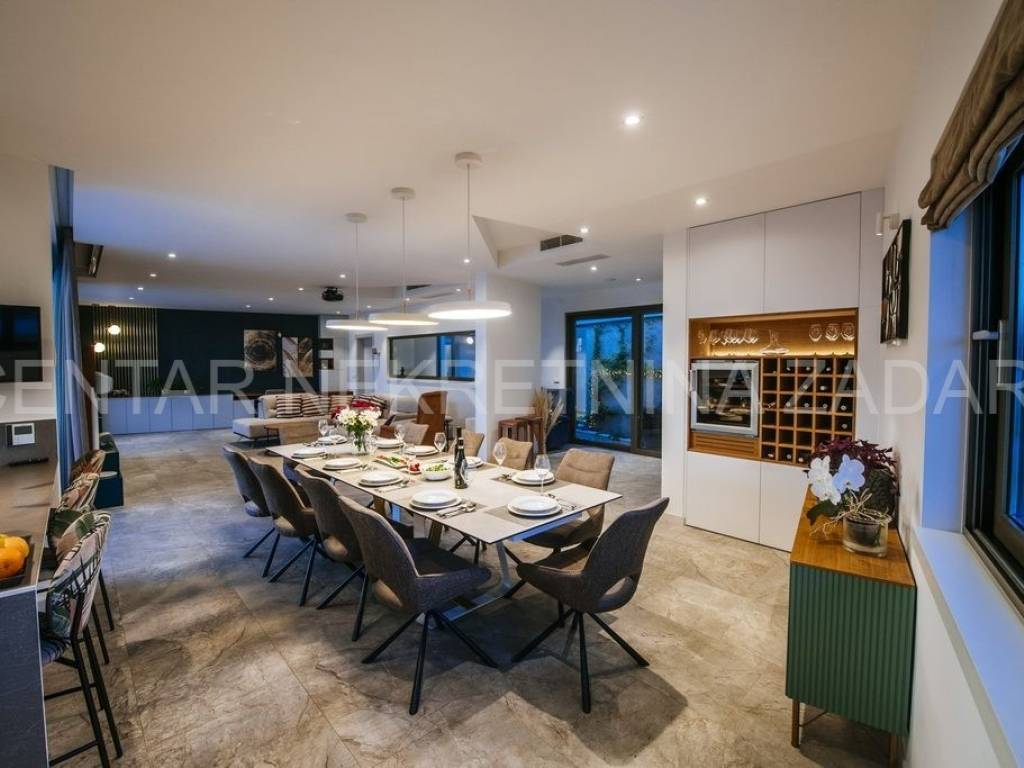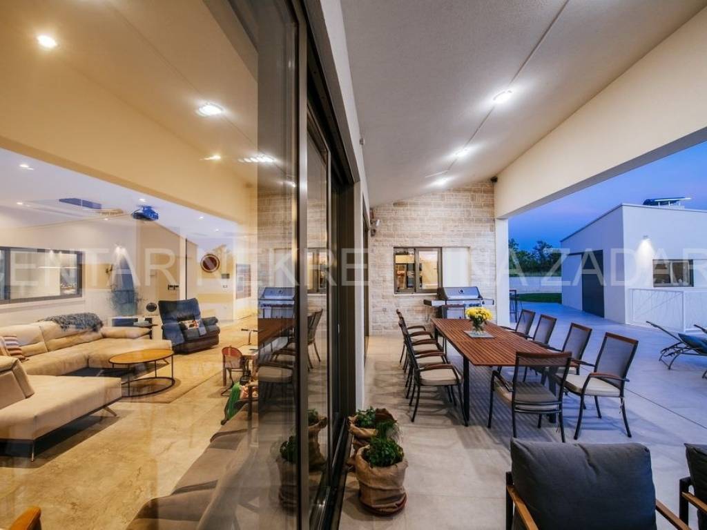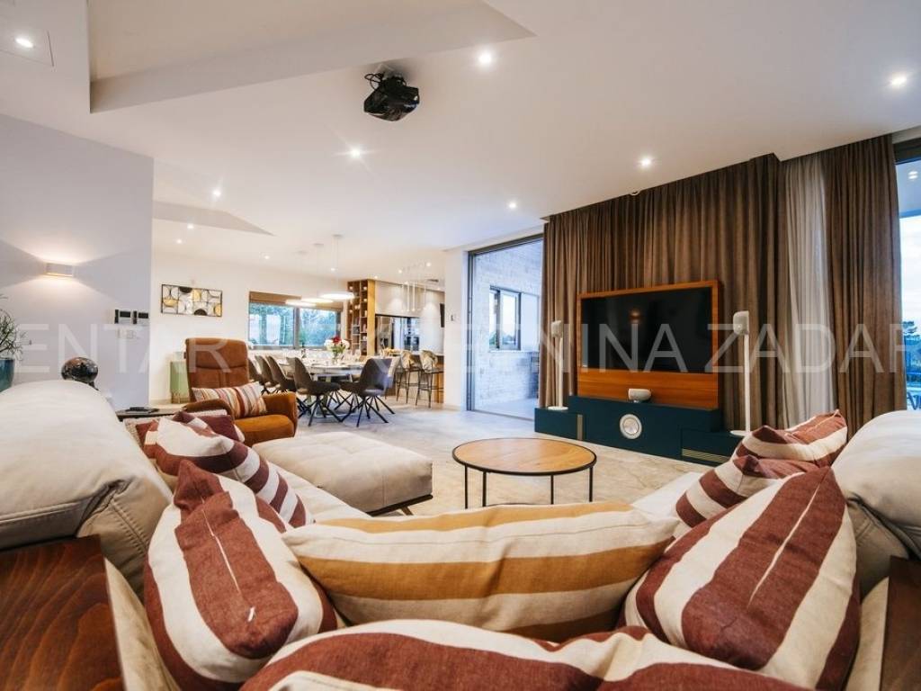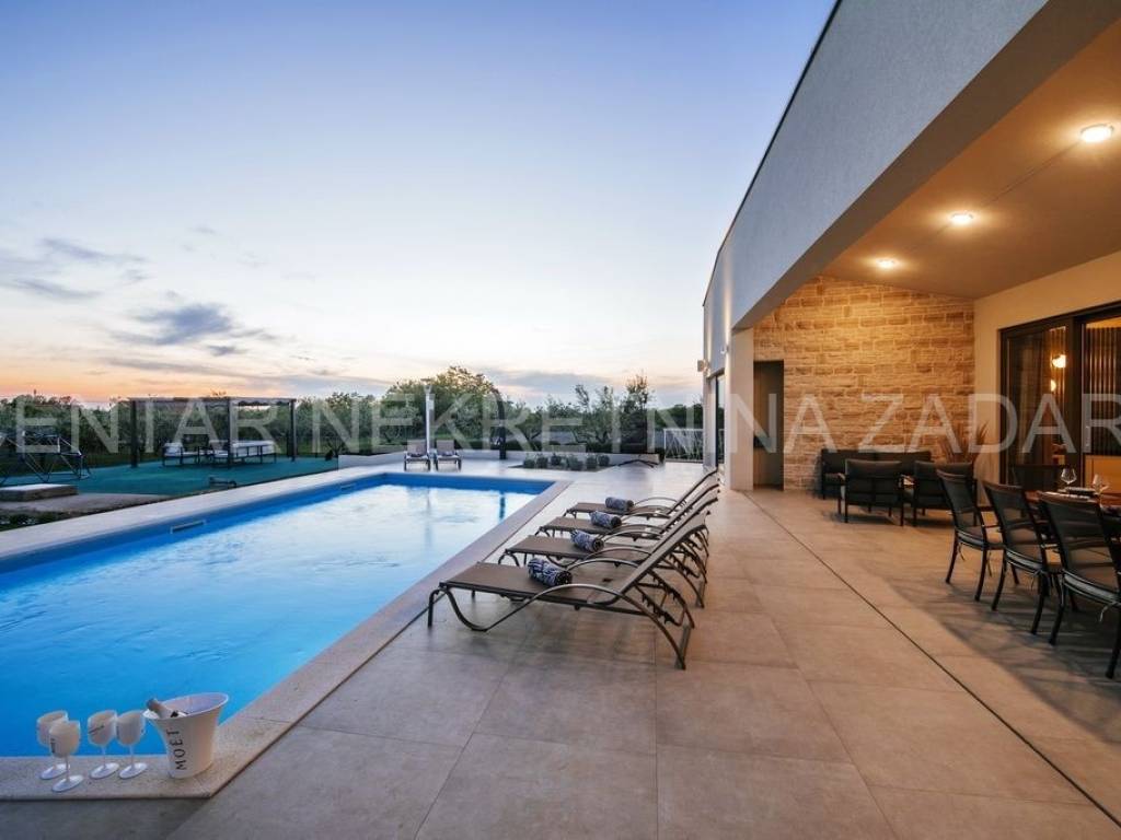 For sale is a unique newly built, modernly equipped luxury villa with pool in Smoković, near Zadar. It was built on a plot of 2850 m2. The total living area is 276 m2, has a spacious kitchen, dining room and living room, toilet, laundry and a total of 5 bedrooms with private bathrooms, equipped with expensive ceramics and toilets and carefully selected custom-made furniture. The living room has access to a large terrace next to the pool measuring 11x5, where there is also an outdoor shower, jacuzzi and entertainment area. Below the pool is the pool engine room, and as part of that space, a sauna and gym can be made. Next to the pool there is an additional facility which houses a barbecue area with toilet, bedroom with bathroom and storage. Within the house there are two garages.