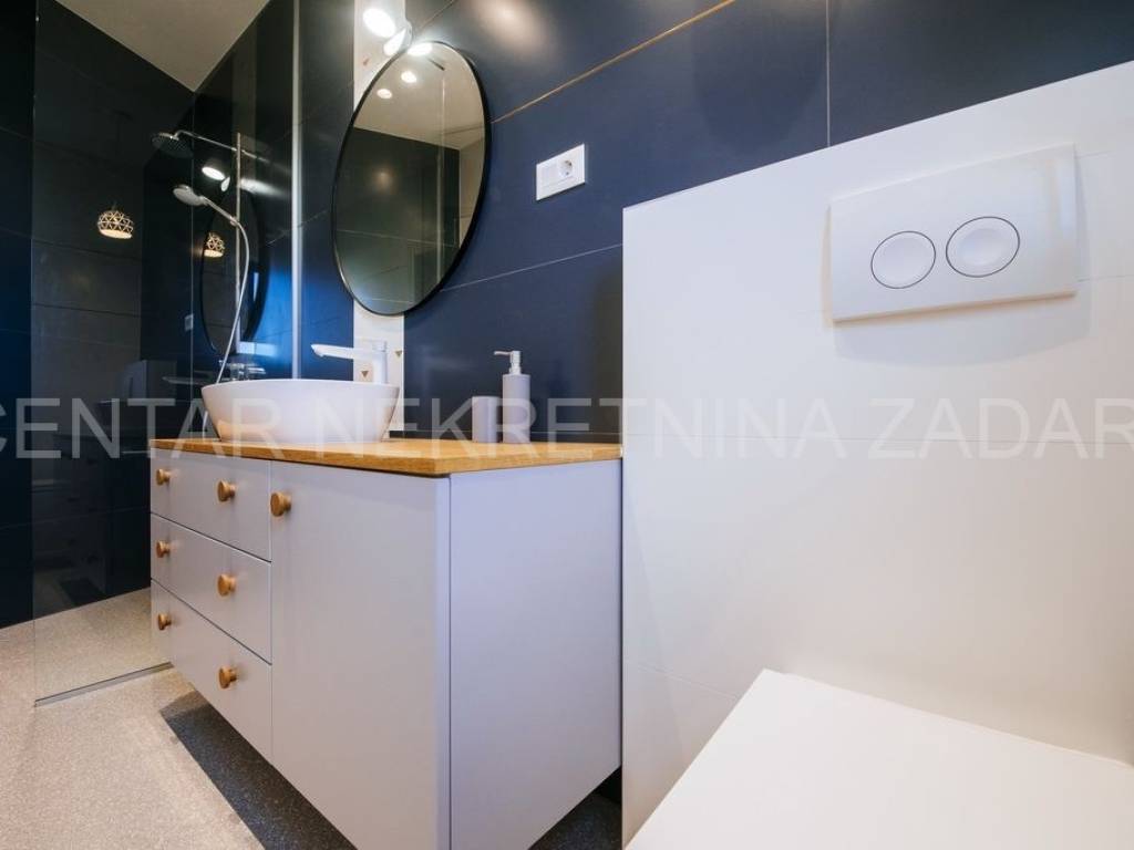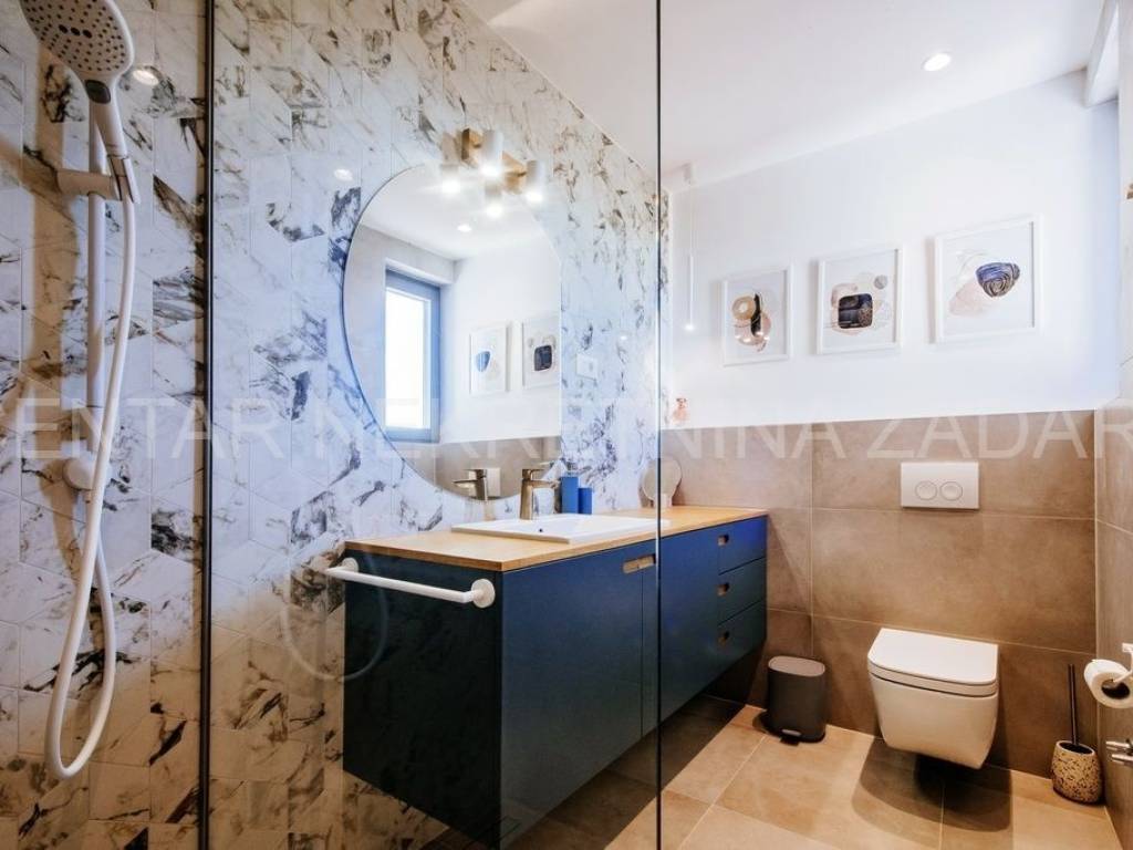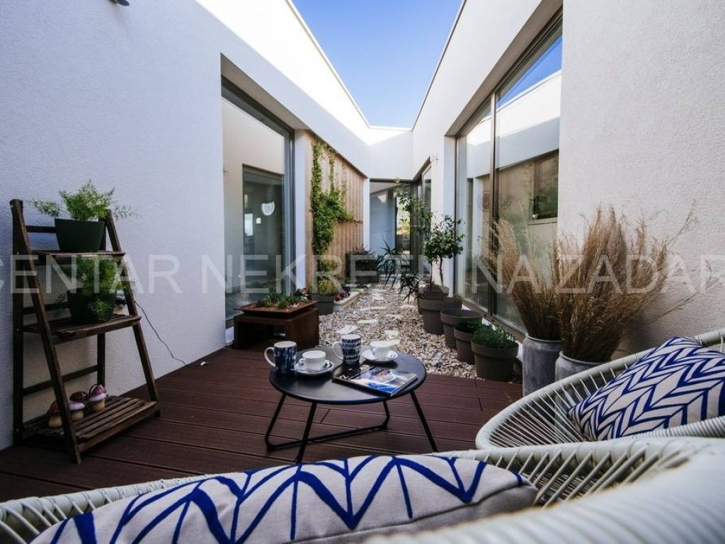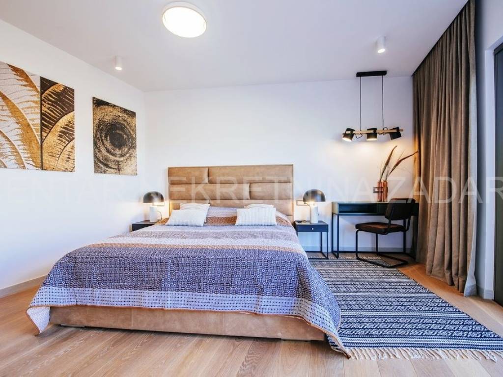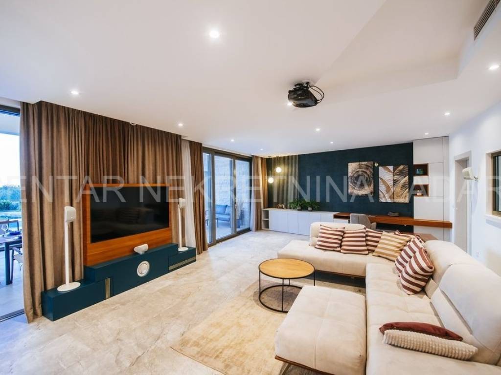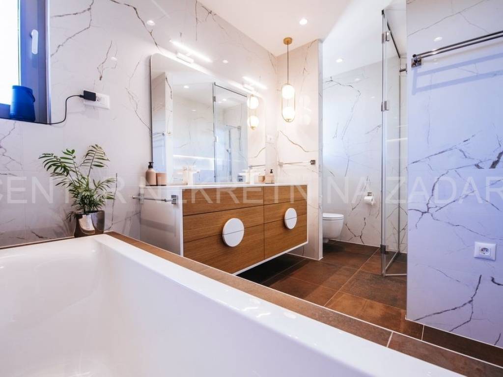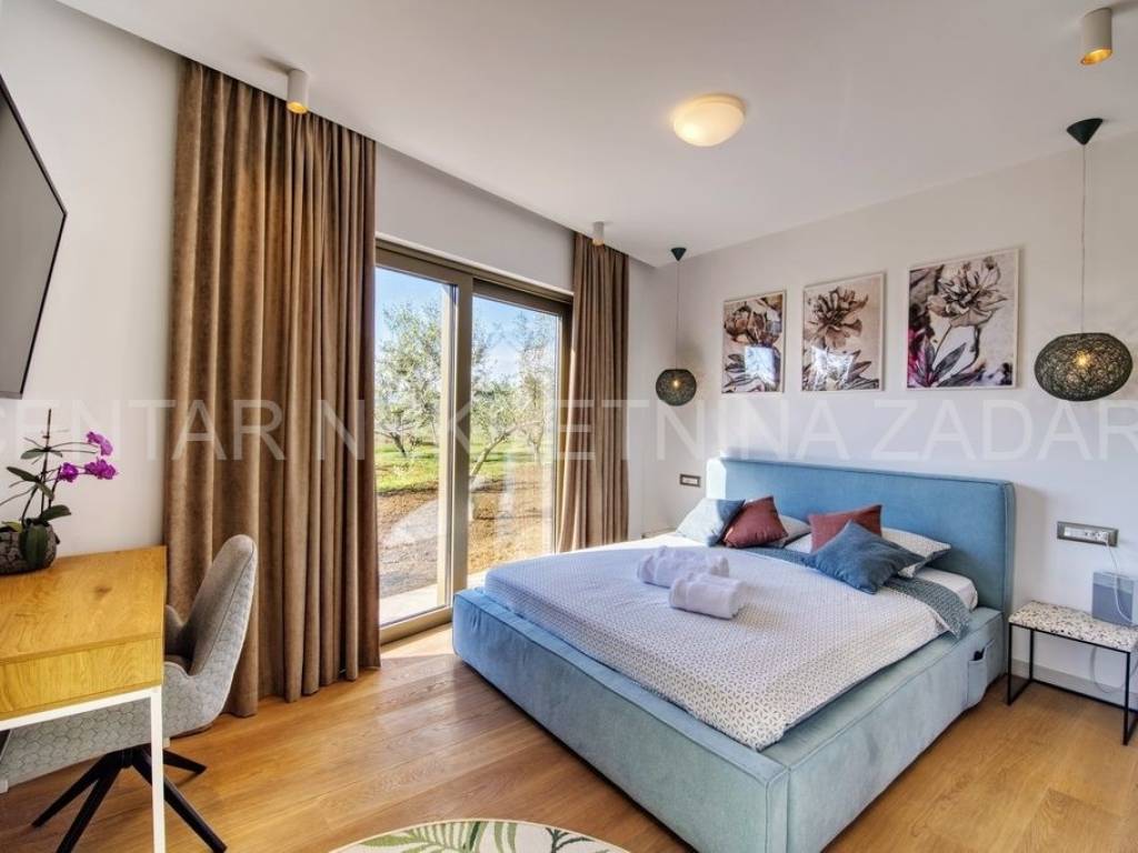 For sale is a unique newly built, modernly equipped luxury villa with pool in Smoković, near Zadar. It was built on a plot of 2850 m2. The total living area is 276 m2, has a spacious kitchen, dining room and living room, toilet, laundry and a total of 5 bedrooms with private bathrooms, equipped with expensive ceramics and toilets and carefully selected custom-made furniture. The living room has access to a large terrace next to the pool measuring 11x5, where there is also an outdoor shower, jacuzzi and entertainment area. Below the pool is the pool engine room, and as part of that space, a sauna and gym can be made. Next to the pool there is an additional facility which houses a barbecue area with toilet, bedroom with bathroom and storage. Within the house there are two garages.