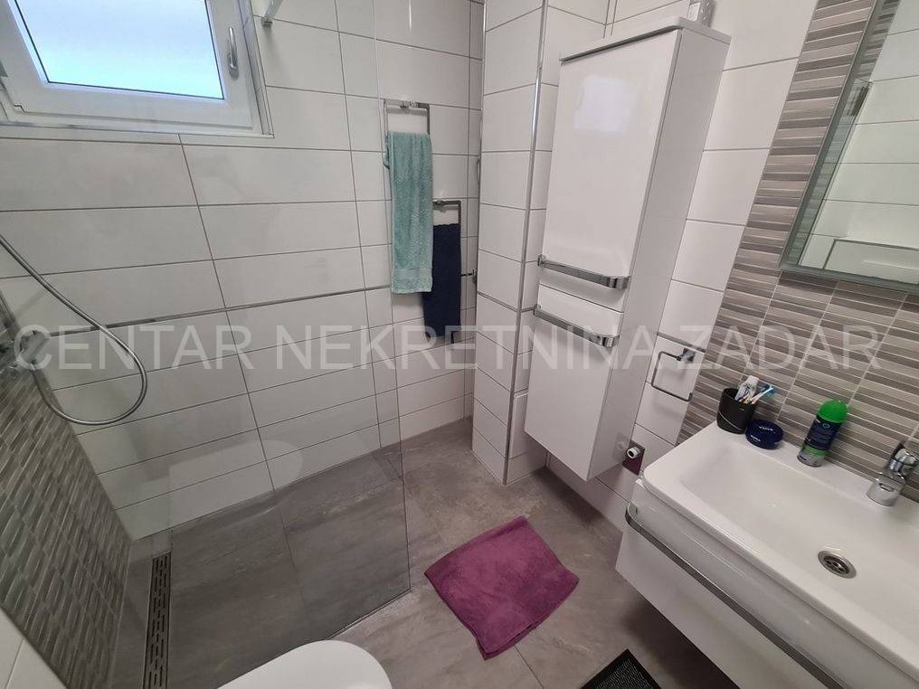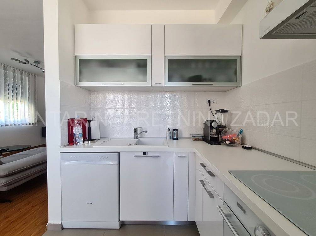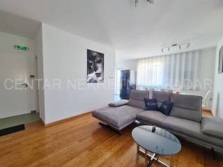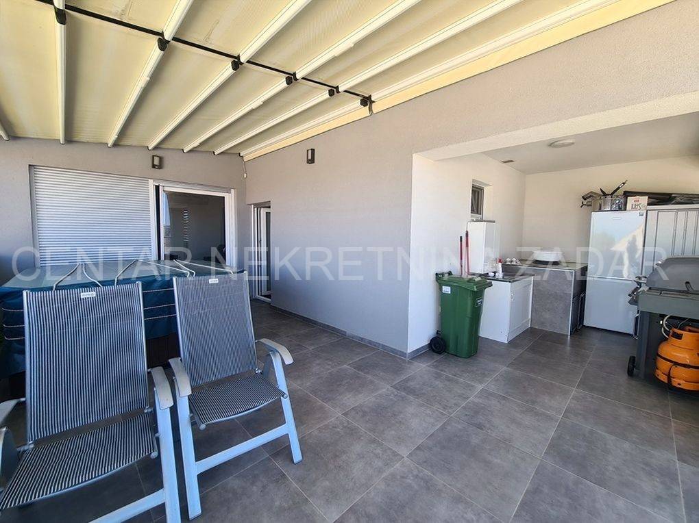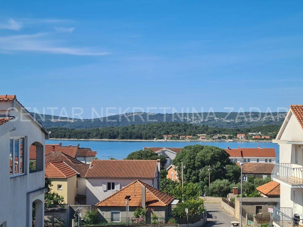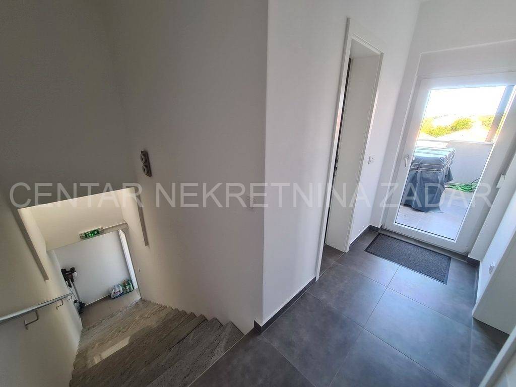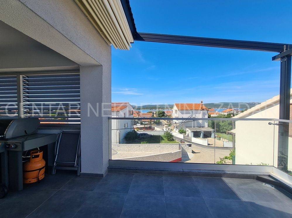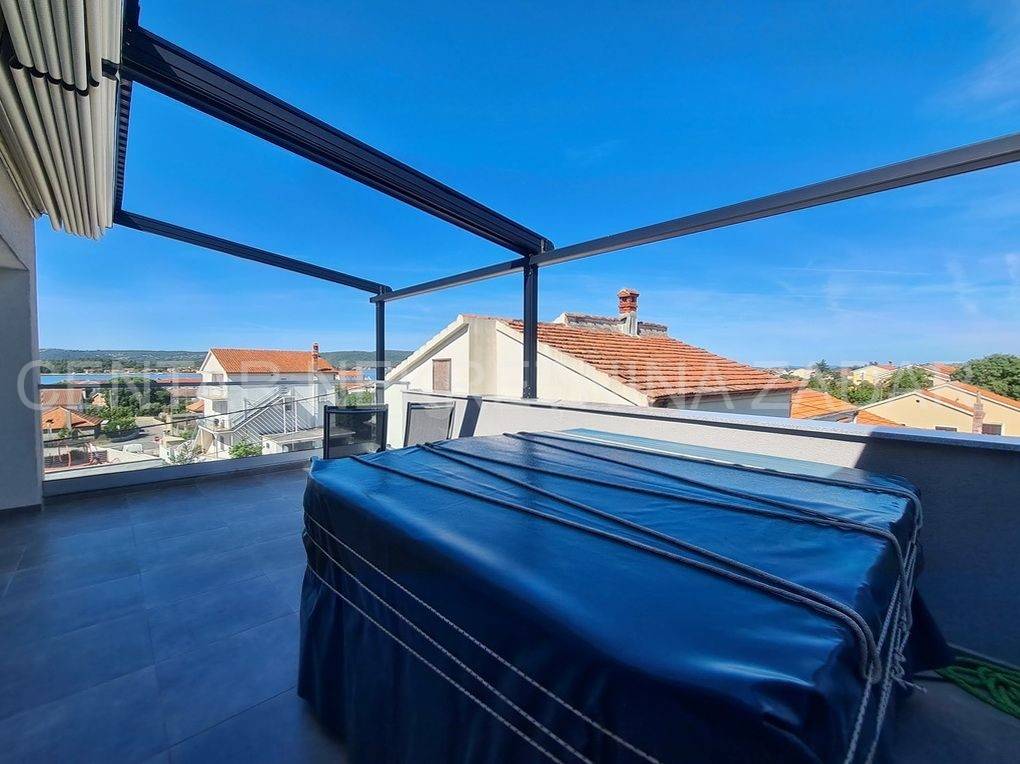 A three bedroom apartment is for sale in an excellent location in Turanj, not far from Sv. Filip i Jakov and Biograd na Moru. The apartment has two floors and is located on the first and second floor of the building. The ground floor and first floor of the building were built in 2010, and then in 2020, after a permit was requested, the second floor was upgraded. The apartment has about 152 m2 of floor space, and has an entrance on the ground floor of the building, which is separate from the other residential units (which means that it also has a staircase that leads from the ground floor to the first floor). The apartment therefore consists of a staircase on the ground floor; a hallway, a bathroom, two bedrooms, a kitchen with a dining room and a living room and a terrace on the first floor and another bathroom, a bedroom, a living room and a large roof terrace on the second floor. The apartment is furnished and equipped with high-quality furniture and appliances and is for saleas such. On the roof terrace there is also a summer kitchen and a jacuzzi. There is a beautiful sea view from the roof terrace as well as from the apartment. Heating and cooling is provided with air conditioning, but a chimney was installed in the living room, so there is a possibility of heating with wood. In the courtyard of the building there is a parking lot (of 37 m2) belonging to the apartment where it is possible to park up to three cars.