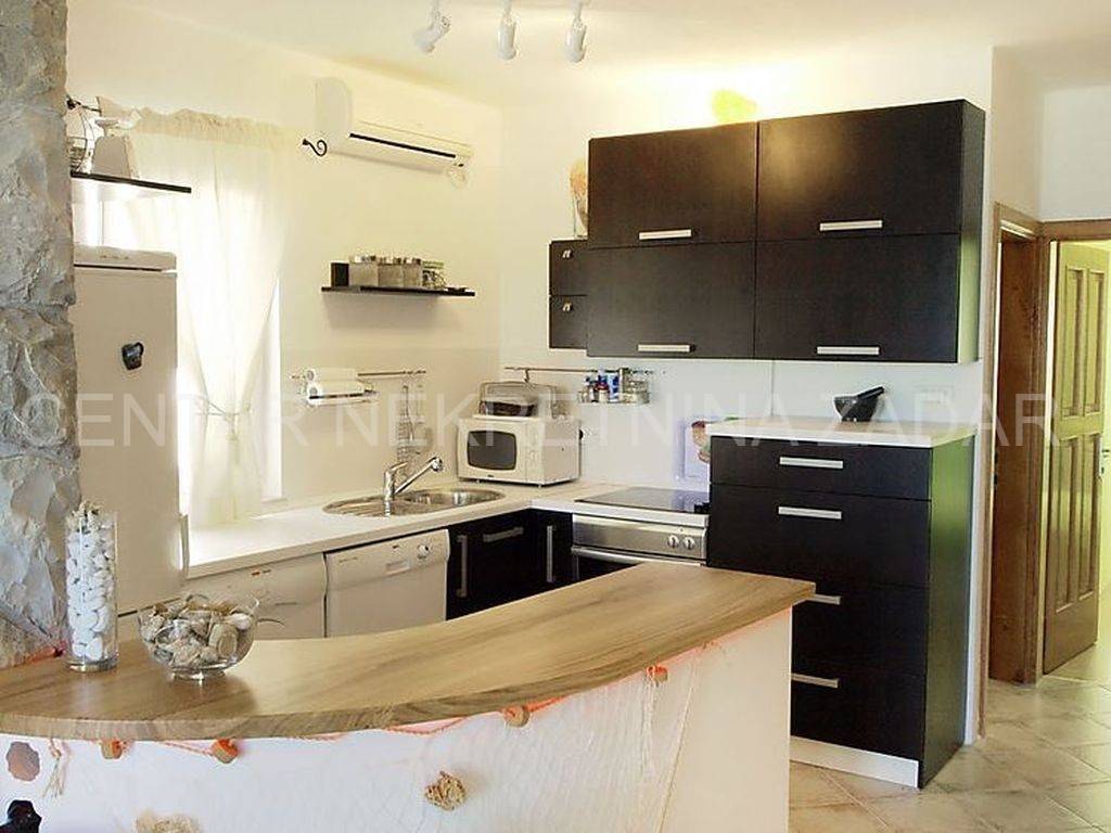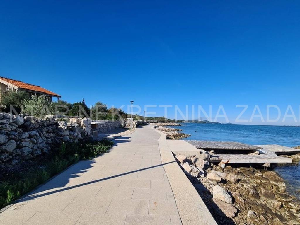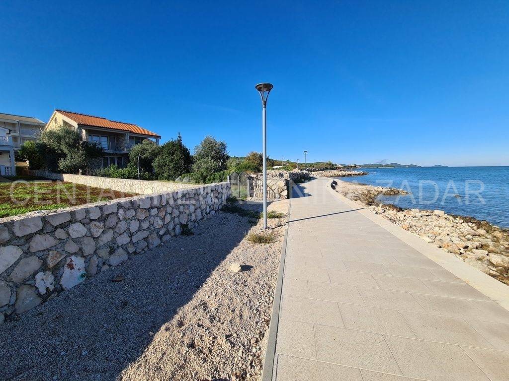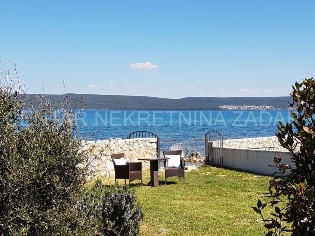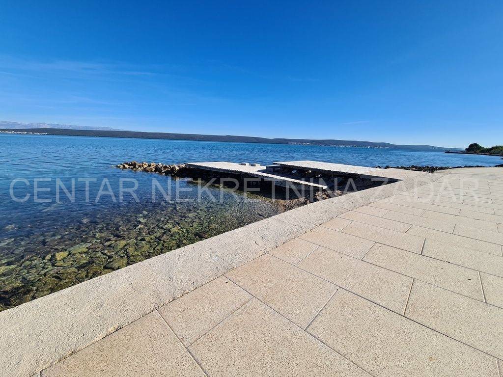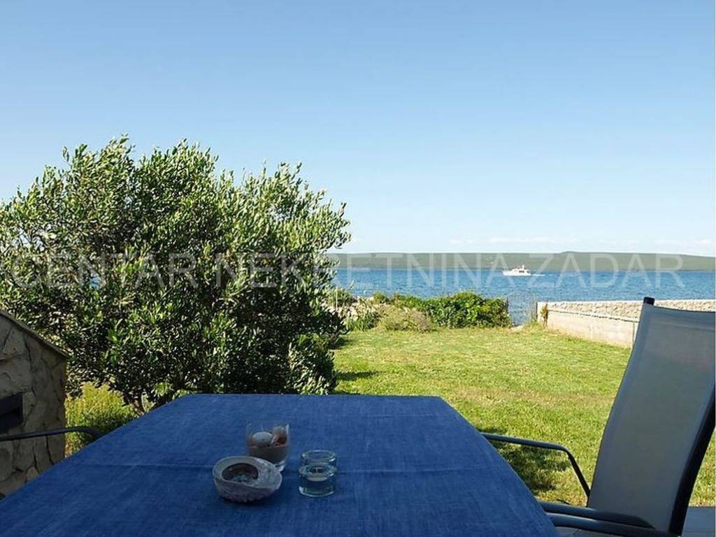 For sale there is half of the house consisting of two apartments - on the ground floor and on the first floor. The apartment on the ground floor consists of a kitchen with a living room, two bedrooms, a bathroom and a toilet. The living room is separated by a glass wall from the terrace of almost 20 m, where the landscaped garden continues and has access to the shore. An external staircase leads to the first floor where there is an apartment with a similar floor plan, which also has a gallery where there is an additional bedroom with a working area. In front of the entrance there is a large terrace with a fabulous view overlooking the sea and the surroundings of Zadar. Both of the apartments are air-conditioned, fully furnished and equipped, and are successfully rented from late spring to autumn.