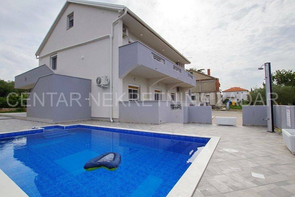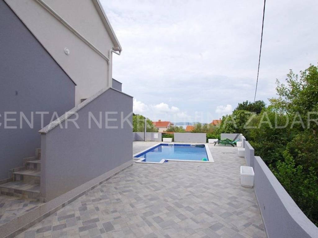 A house with a swimming pool for sale in Kožino, located only 100 m away from the sea. Its area is about 370 m, and it was built on a plot of 686 m. The ground floor and first floor were built in 1971. while the terraces, staircase and attic were added in 2018 when a thermally insulated facade was also installed.