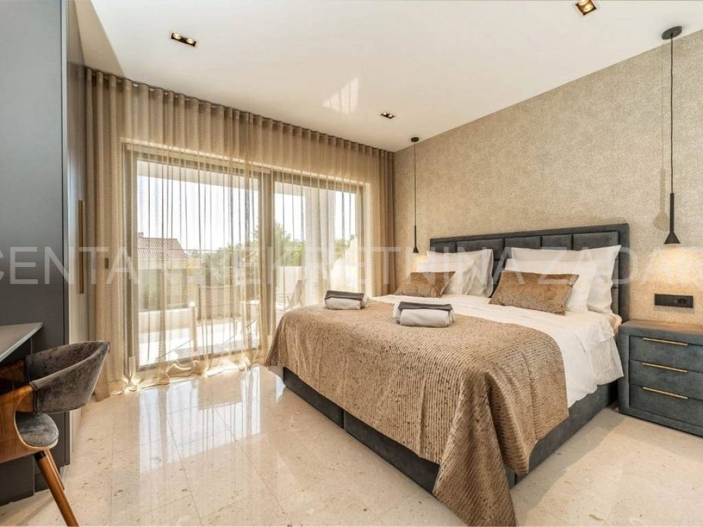 A luxurious newly built house with a swimming pool located in Privlaka is for sale. This detached two-story house was built in 2022 and is located in a quiet part of the village. The house stands out with its modern architecture and interior, as well as top-quality equipment.The living area of the house is 360 m2, and it consists of one residential unit that extends over three floors. On the ground floor of the house there is a hallway, a bathroom, a laundry and an engine room, an open concept kitchen with a dining room and a living room. The ground floor leads to a covered terrace with a view of the garden and the pool. An internal staircase leads to the first floor where there is an entrance hall and four luxuriously decorated bedrooms with bathrooms. Two of the bedrooms have their own covered terraces with a view of the garden and the pool, and the master bedroom also has a bathtub. Theinternal staircase also leads to the last floor of the house - the roof terrace. The roof terrace is a true oasis for enjoyment. It has a fully equipped covered summer kitchen, an outdoor shower, deckchairs and a jacuzzi.The heating and cooling system of the house is provided by air conditioners, underfloor heating and a fireplace. Underfloor heating and air conditionsare located in almost all rooms of the house and function using a heat pump.