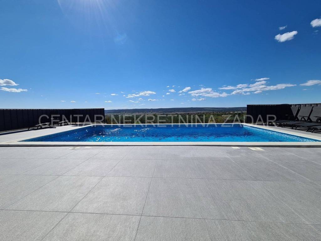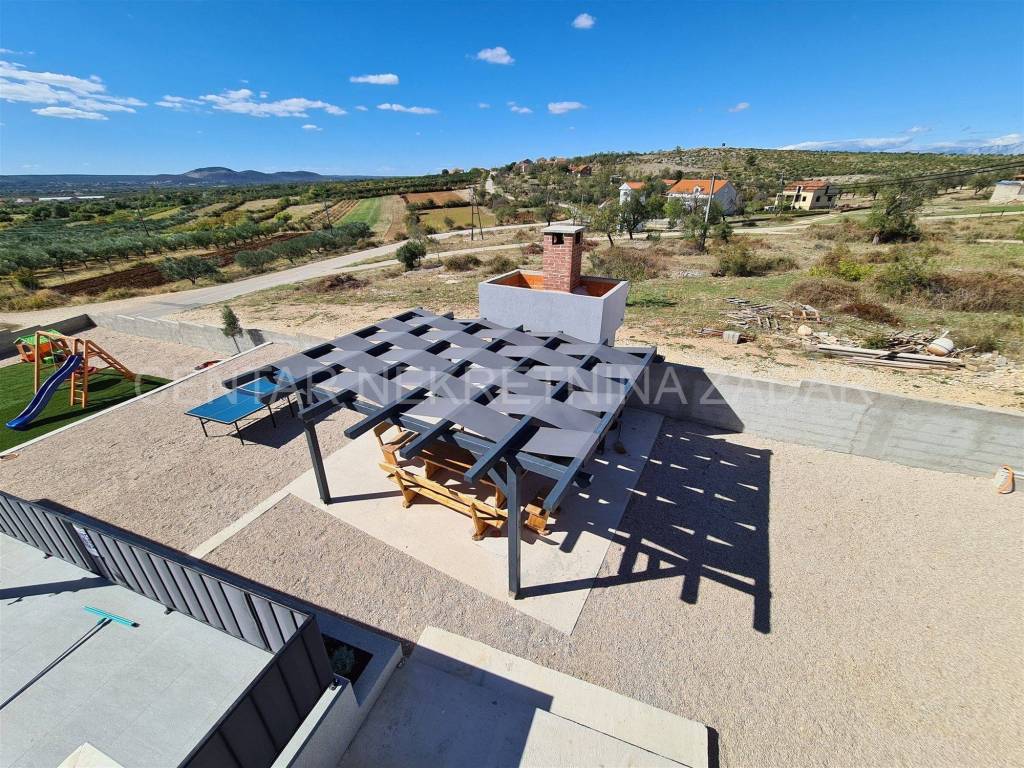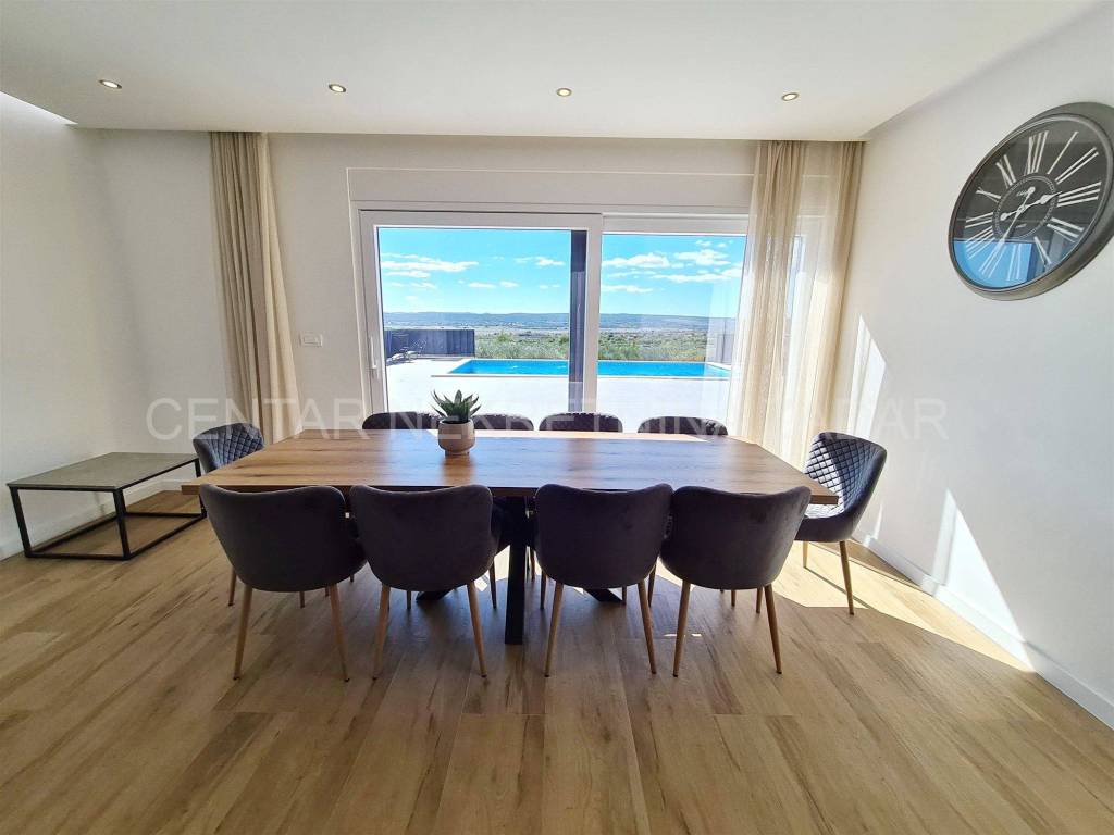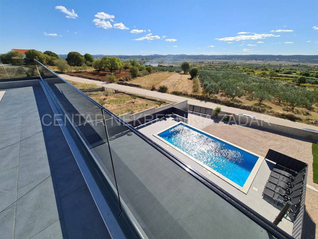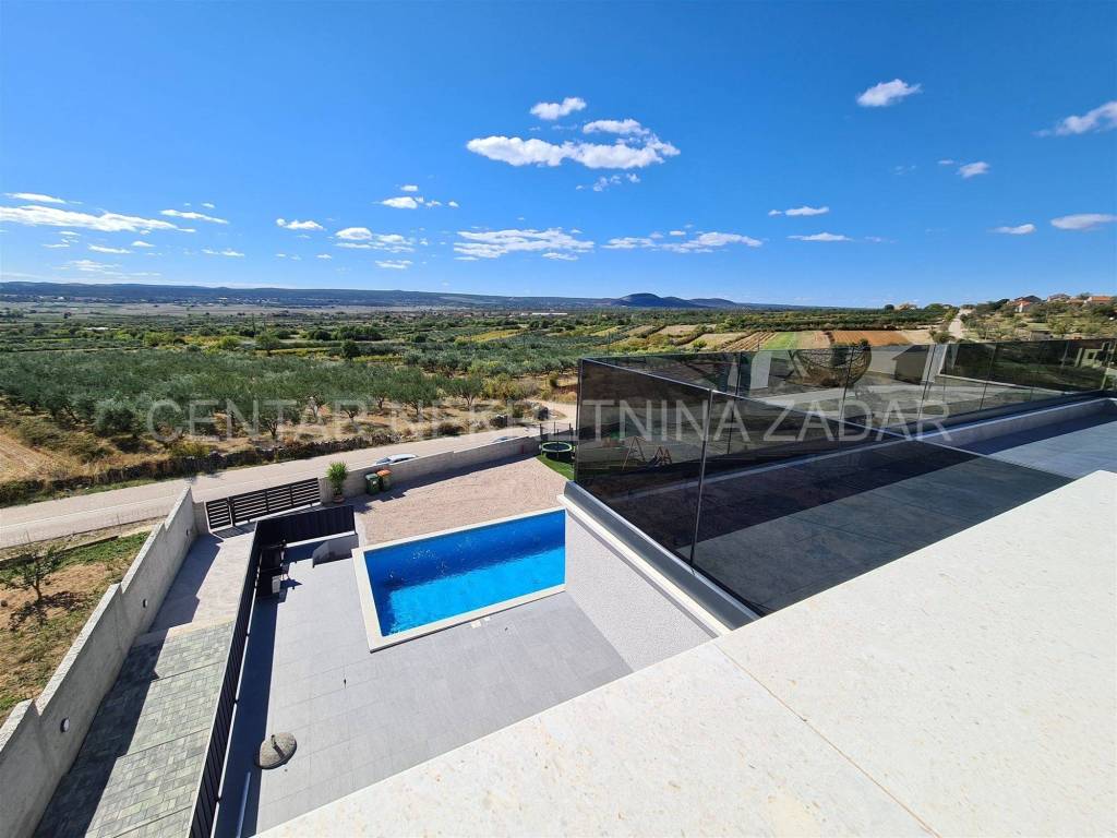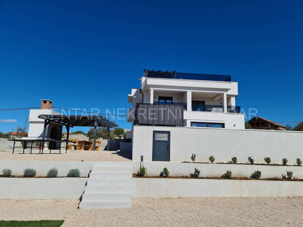A newly built villa with a swimming pool in the vicinity of Biograd is for sale. It was built on a plot of land of 1020 m, while the net residential area of the building of 268 m is divided into basement, ground floor, first floor and flat roof.