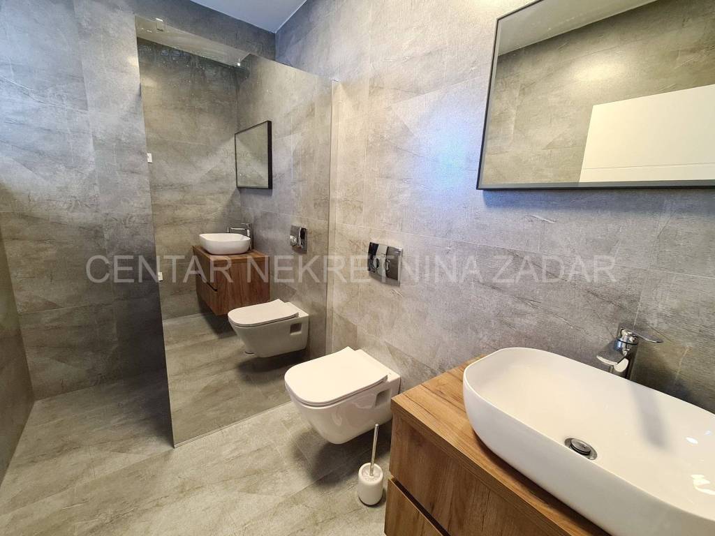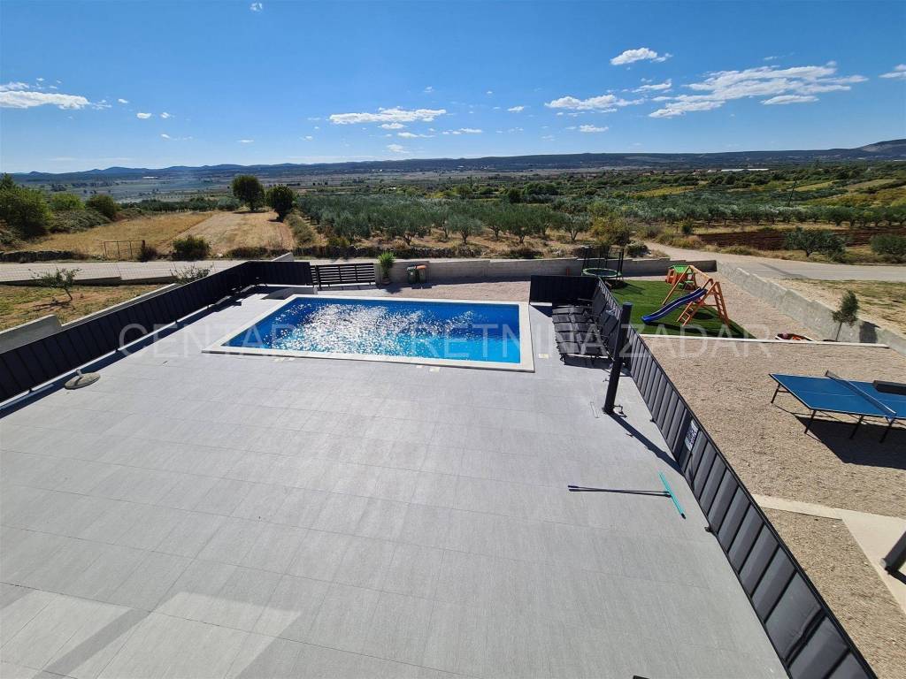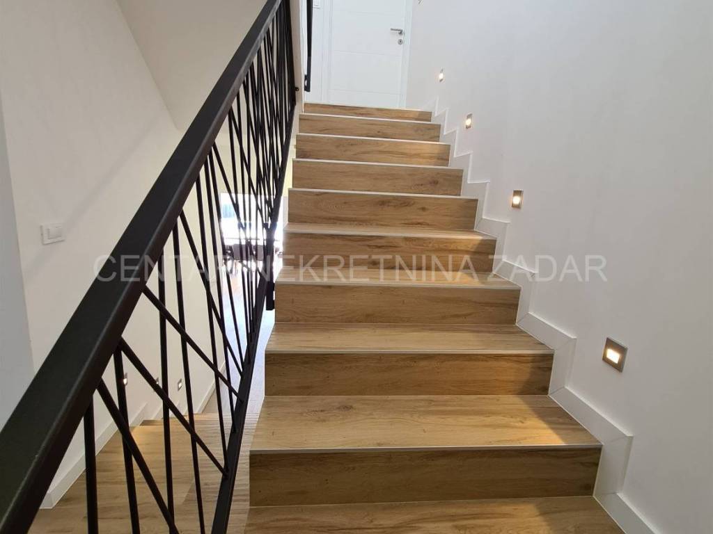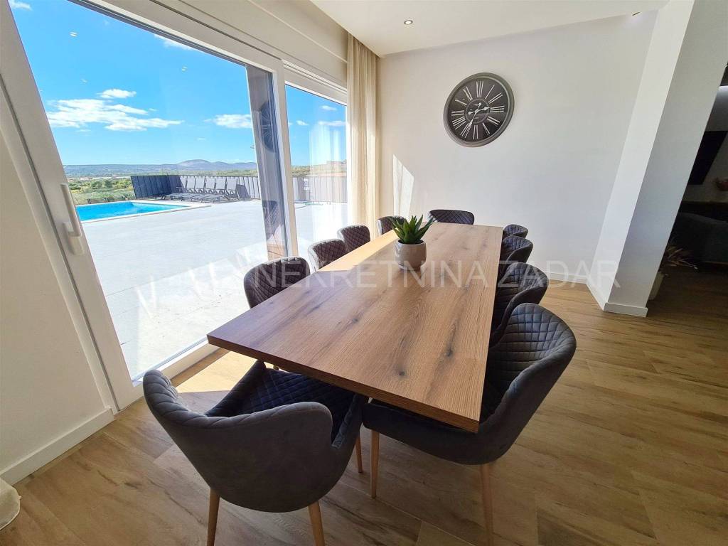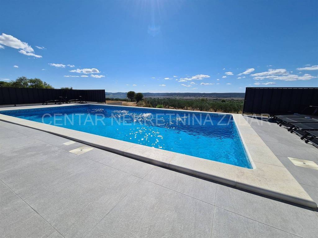 A newly built villa with a swimming pool in the vicinity of Biograd is for sale. It was built on a plot of land of 1020 m, while the net residential area of the building of 268 m is divided into basement, ground floor, first floor and flat roof.