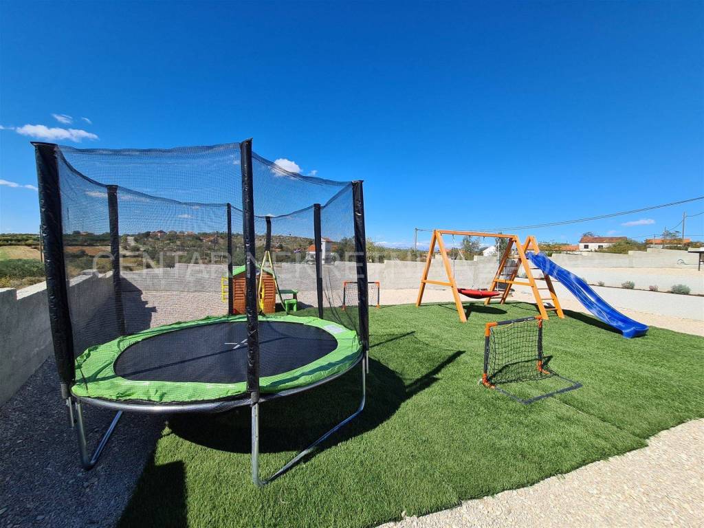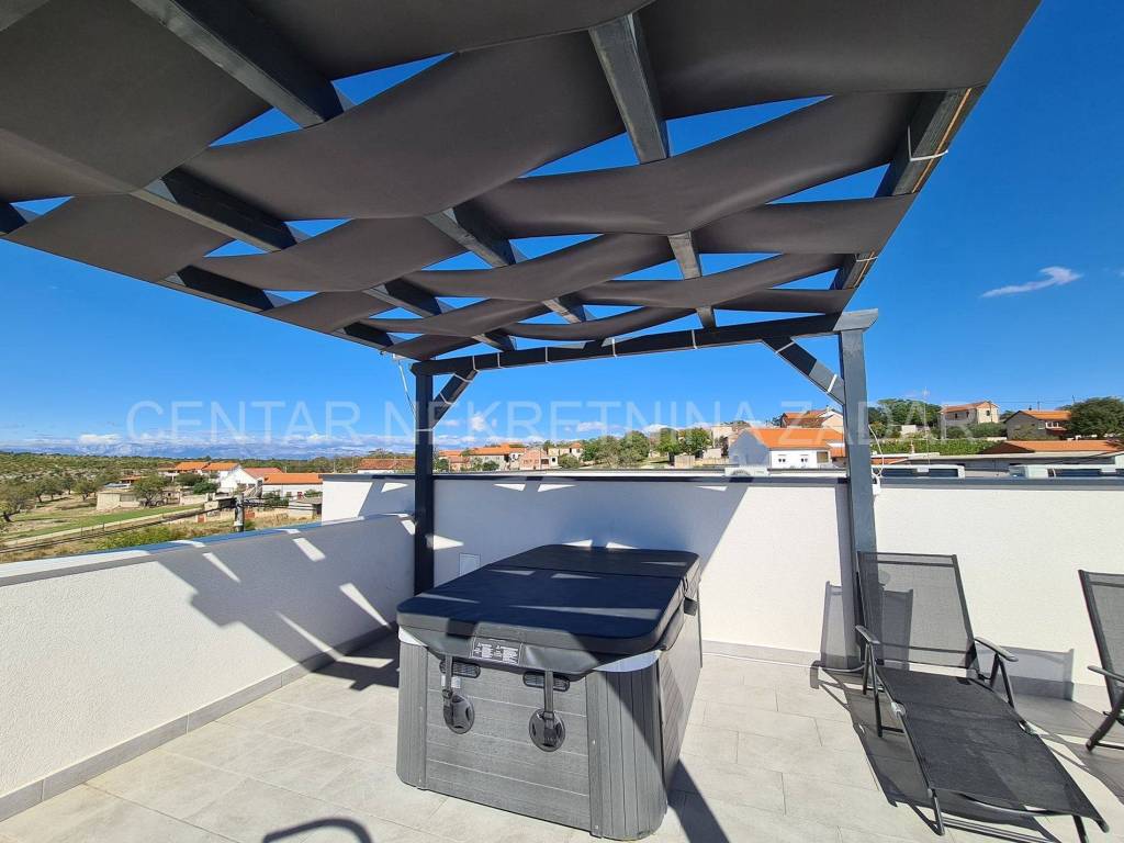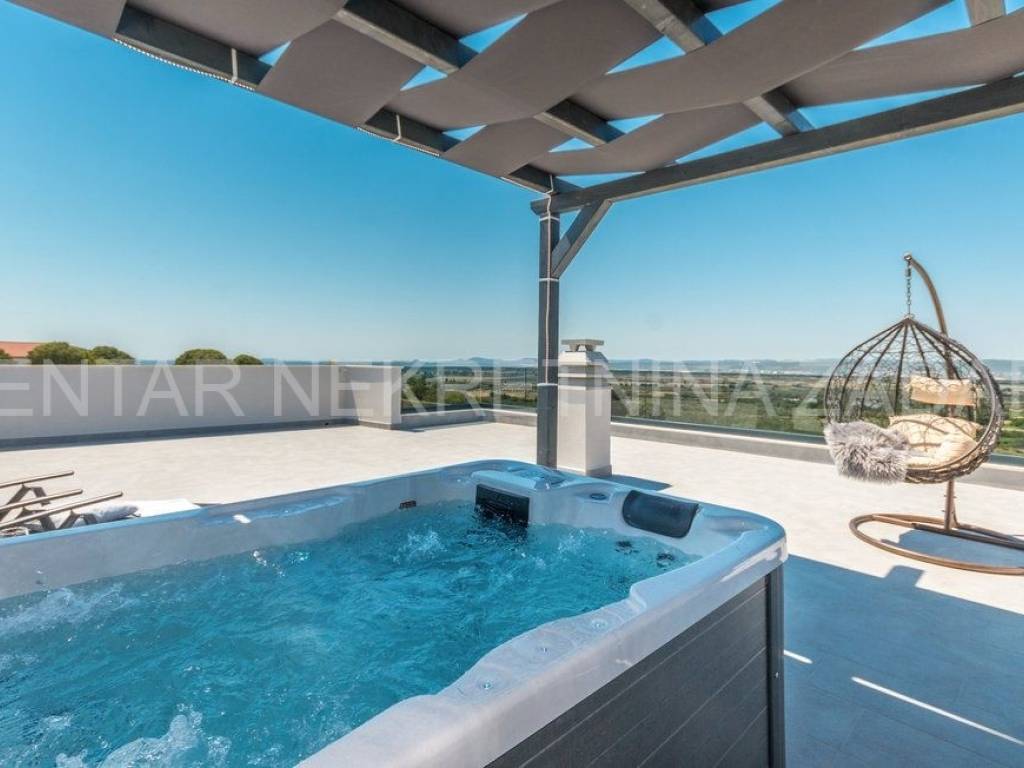 On the ground floor there are a kitchen with a living room (40 m), one bedroom with a terrace, a bathroom and a laundry room. The dining room has access to the courtyard terrace of 40 m, where there is a swimming pool with a sunbathing area and an outdoor shower. There are two spacious bedrooms with bathrooms on the mezzanine floor, and another bedroom with a bathroom on the first floor. All rooms have their own terraces. From the first floor, you can access a large roof terrace of 60 m, from which you can enjoy an unobstructed view on all four sides of the world - on the fields, Lake Vrana and Velebit. On the roof terrace, under the pergola, there is a jacuzzi.