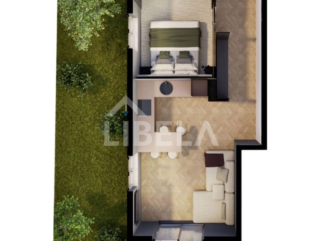 Stan 1-B sastoji se od dnevnog boravka s blagovaonicom i kuhinjom, spavaće sobe, kupaonice, hodnika, natkrivene terase i vrta.