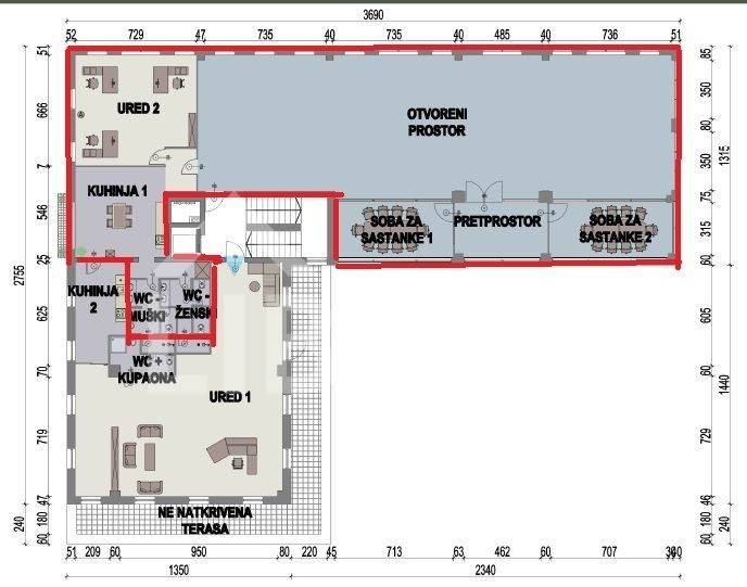 Sastoji se od velikog open space prostora, 4 ureda, kuhinje i toaletima.