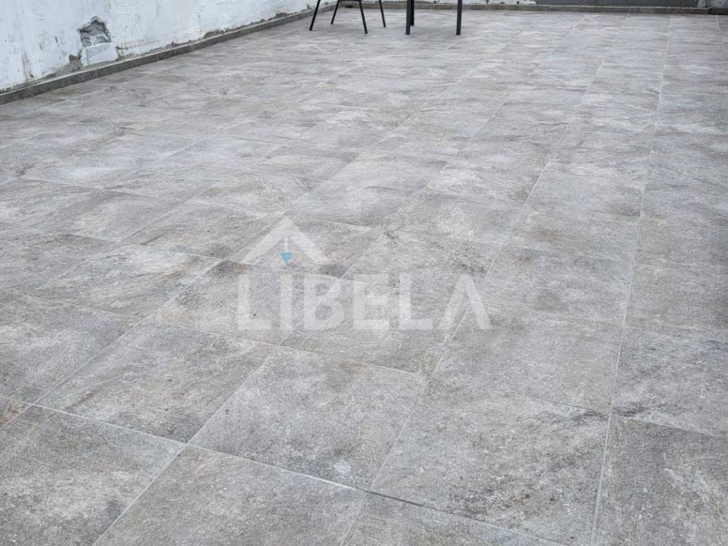 Kuća se sastoji iz dva odvojena dijela. Prvi dio kuće okrenut je prema moru i gleda na slikoviti trg s brojnim restoranima i kafićima. Ovaj dio predstavlja izvrsnu priliku za turističke svrhe. Sastoji se od prizemlja, prvog kata i prostrane krovne terase s prekrasnim pogledom na more. Prizemlje trenutačno nudi poslovni prostor koji je već uređen i iznajmljuje se. Na prvom katu nalazi se stan s dvije spavaće sobe, kupaonicom, kuhinjom i dnevnim boravkom, te malim balkonom. Na vrhu ovog dijela kuće nalazi se ravan krov s terasom koja pruža panoramski pogled na more i trg.