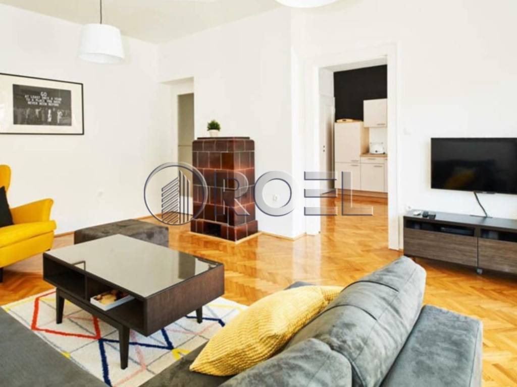 Spacious three-room apartment located on the fourth floor of a quality building with an elevator in Pod Zidom street, NKP 90 m2. It has an excellent layout. It consists of an entrance hall, a living room with a balcony with a beautiful view of the city, a large kitchen and dining room, two bedrooms and two bathrooms with a toilet. It is full of natural light. Heating in the apartment is gas central. The floor in the apartment is covered with parquet and ceramics. The entrance door of the apartment is anti-burglary with a code. The apartment is fully furnished and equipped.