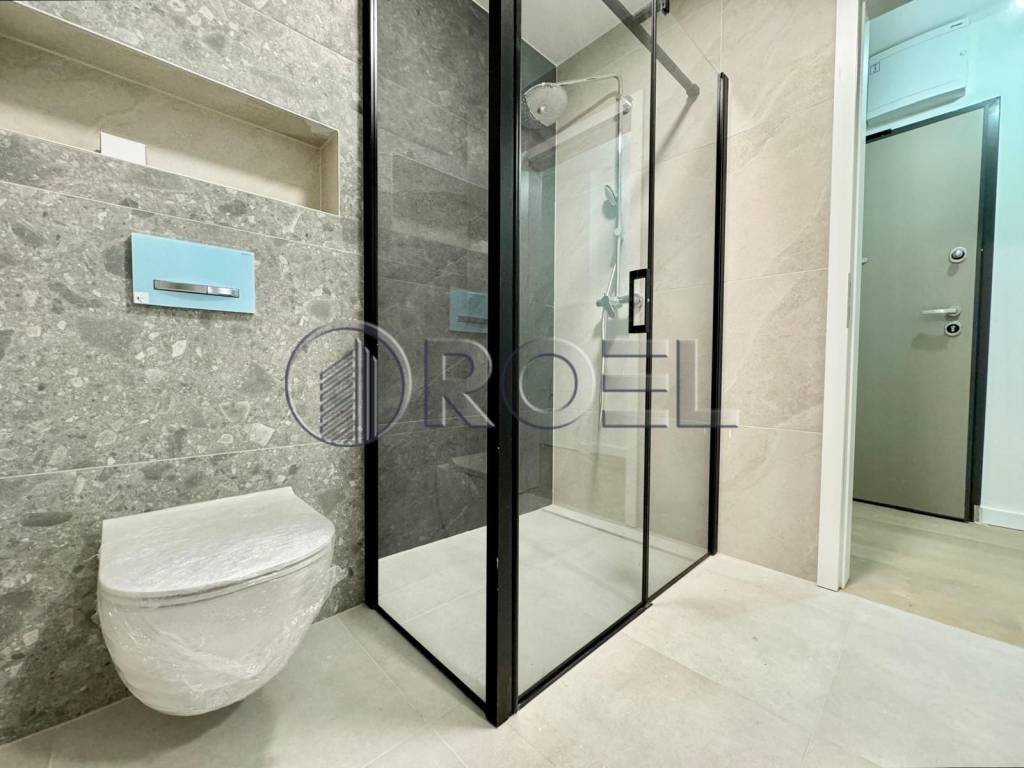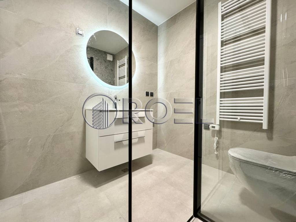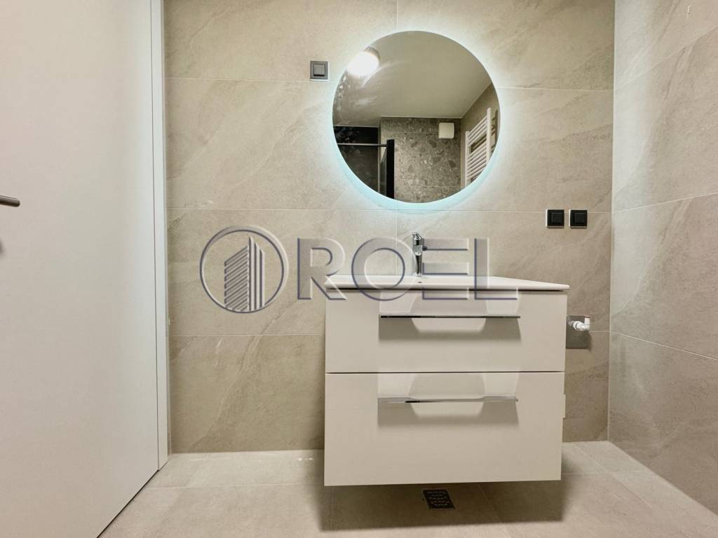 Kupaonica ima već ugrađeni umivaonik i ogledalo te ostale sanitarije ronomiranih proizvođača, a dizalice topline smještene su u ugradbenim ormarima u hodniku s ogledalom koji tkđ. dolaze uz stan.